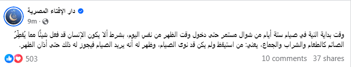 وقالت دار الإفتاء، إن الصائم إذا استيقظ ولم يكن قد نوى صيام ستة أيام، ثم ظهر له أنه يريد الصيام في نفس اليوم، يجوز له أداء النية حتى أذان الظهر، مع الالتزام بالباقي من اليوم كما هو للصائم.