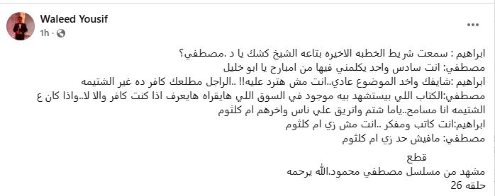 نشر السيناريست وليد يوسف مشهد من مسلسل “مصطفى محمود” الذي يروي السيرة الذاتية للدكتور مصطفى محمود ، والذي قام وليد بكتابته منذ عدة سنوات ، وذلك على صفحته بموقع التواصل الاجتماعي “فيسبوك” .
