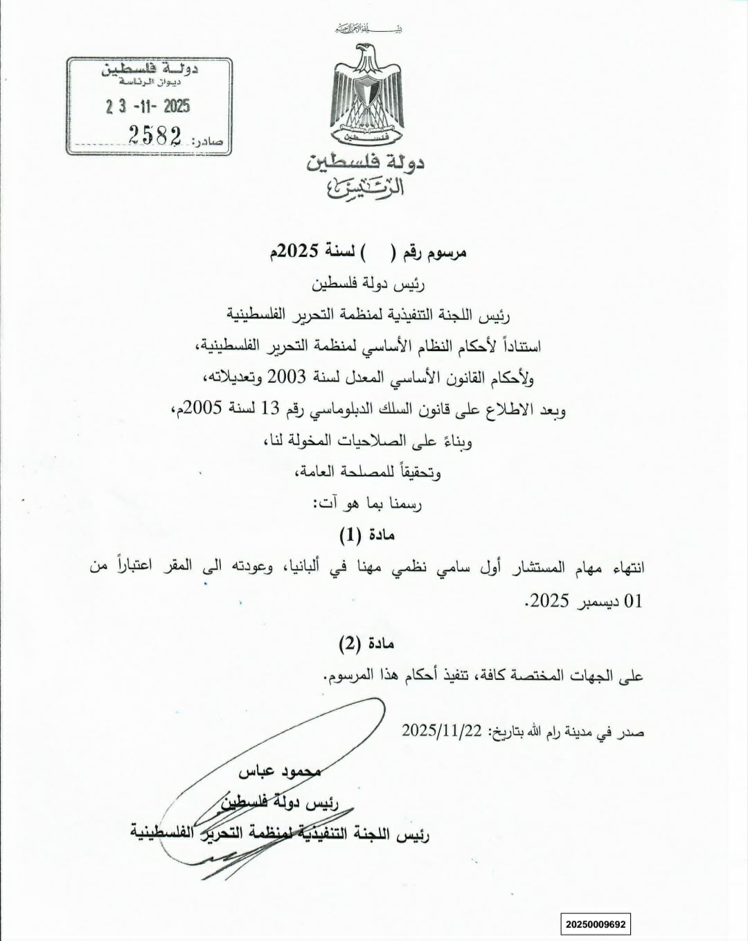 واللافت في الأمر أن المرسوم الصادر عن الرئيس محمود عباس جاء خاليًا من رقم رسمي، وهو ما يثير تساؤلات قانونية جوهرية؛ إذ كيف يمكن لقرار مهني مصيري أن يصدر دون توثيق رقمي واضح يُعد أحد أركان صحة القرارات الإدارية؟