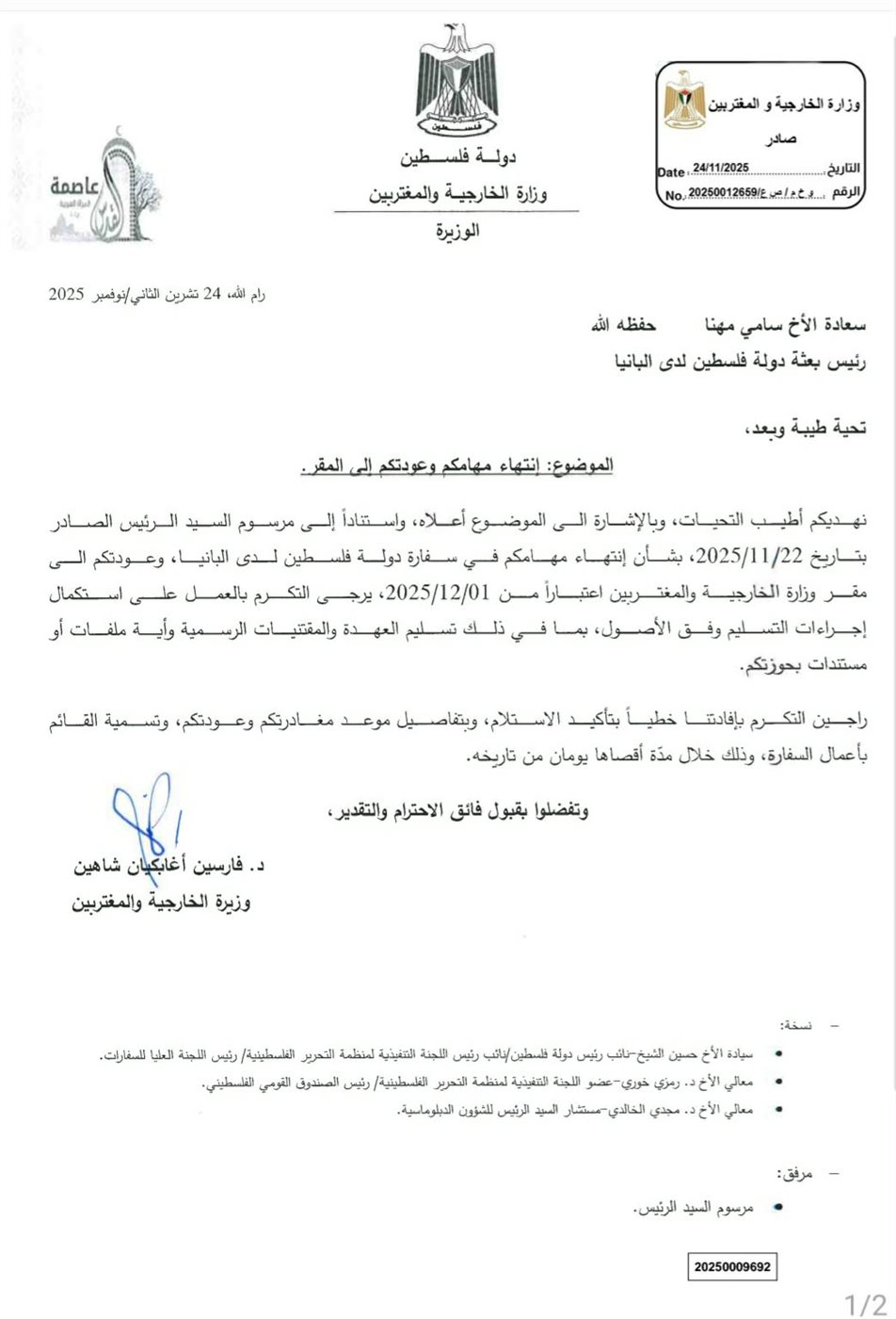 وفي السياق ذاته، يبرز خطاب وزارة الخارجية الفلسطينية كعنصر إضافي مثير للجدل، حيث منح مهلة لا تتجاوز يومين فقط لإنهاء المهام، وهي مدة تبدو غير منطقية عمليًا لسفير يدير بعثة دبلوماسية، بما يشمل تسليم العهدة والملفات والعلاقات الرسمية، وهو ما يتعارض مع الأعراف الدبلوماسية المستقرة، حتى وإن لم يُنص عليه صراحة في القوانين.