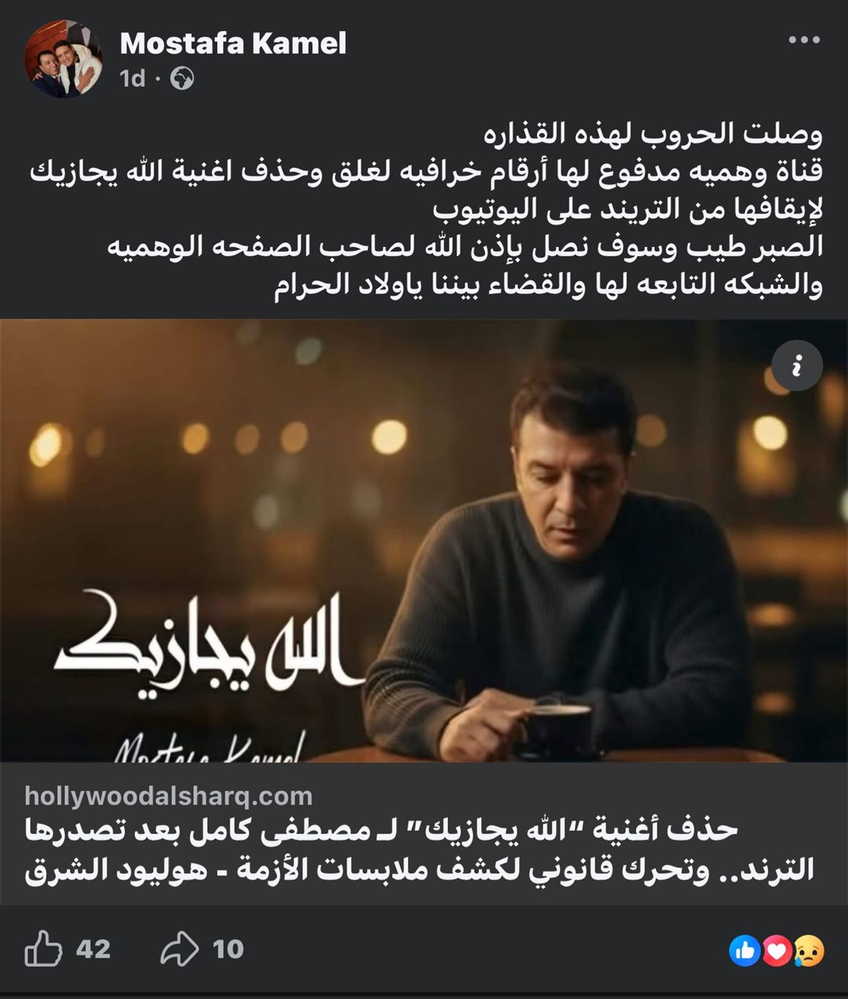 قال مصطفى كامل: “وصلت الحروب لهذه القذاره؟! … قناة وهميه مدفوع لها أرقام خرافيه لغلق وحذف اغنية الله يجازيك لإيقافها من التريند على اليوتيوب”.