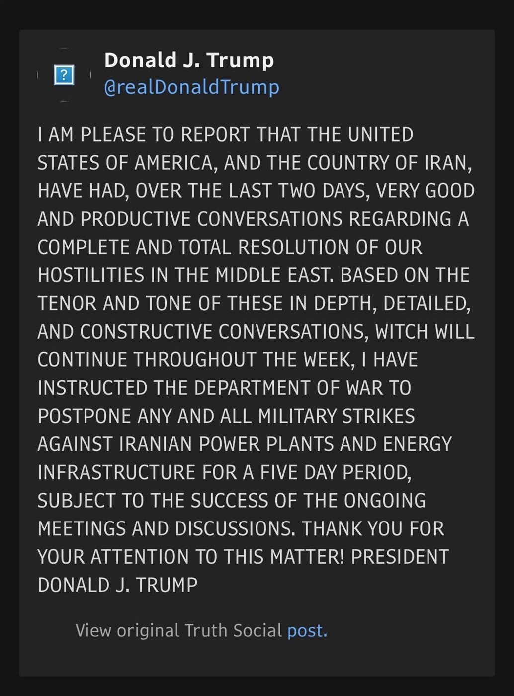 وأضاف: "استنادًا إلى مضمون هذه المحادثات المعمقة والمفصلة والبناءة، والتي ستستمر طوال هذا الأسبوع، فقد أصدرتُ تعليماتي لوزارة الحرب بتأجيل جميع الضربات العسكرية ضد محطات الطاقة الإيرانية وبنيتها التحتية للطاقة لمدة خمسة أيام، رهناً بنجاح الاجتماعات والمناقشات الجارية".