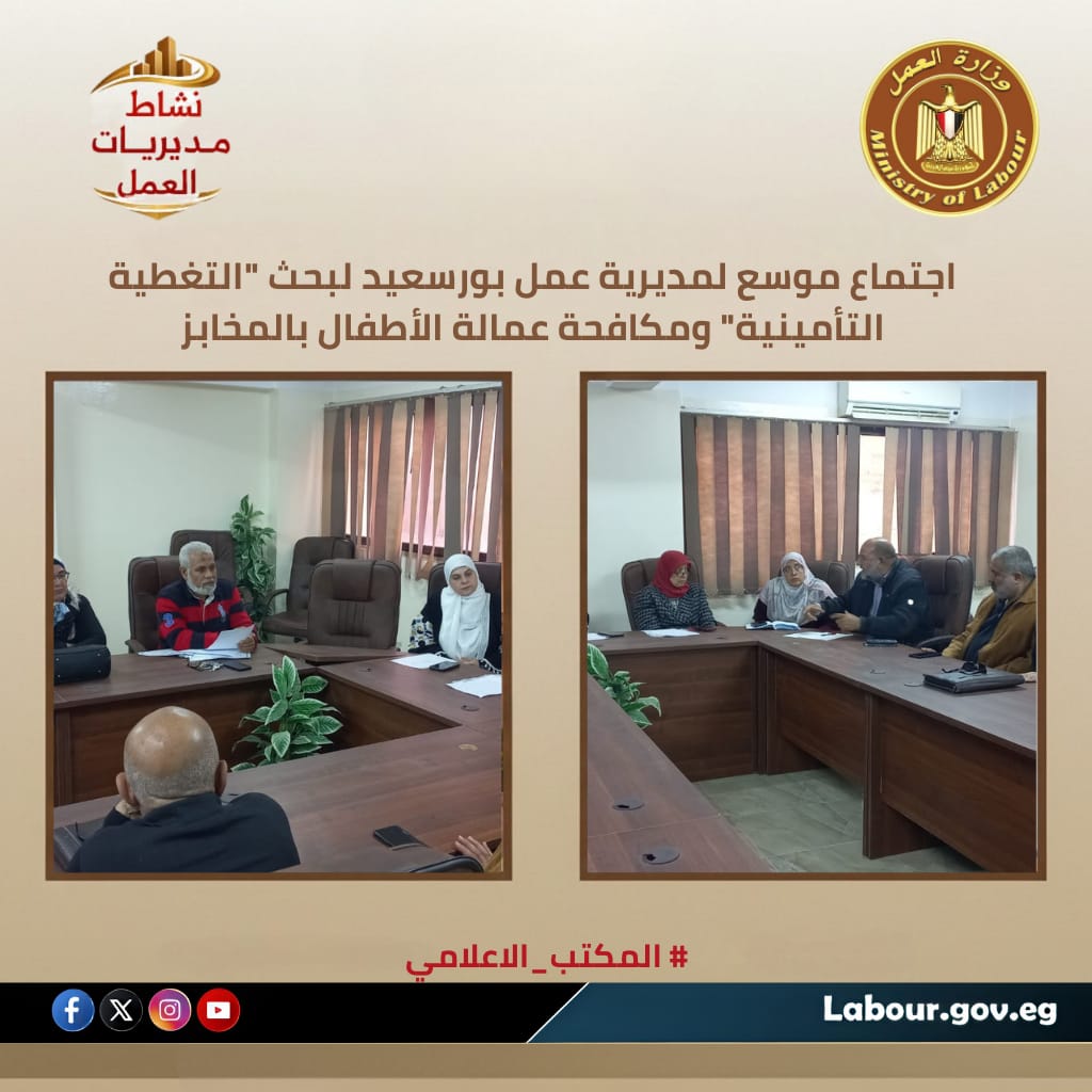 عقدت إيمان مسعد، مدير مديرية عمل بورسعيد، الاجتماع الدوري لمكتب عمل المخابز بحضور ممثلي هيئة سلامة الغذاء والتأمينات والتموين.