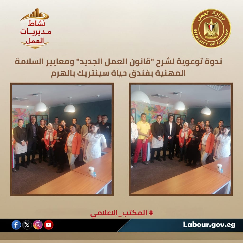 وفي سياق منفصل، نظمت مديرية عمل الجيزة بقيادة كريم أبوالسعود، ندوة تثقيفية بمقر فندق "حياة سينتريك".