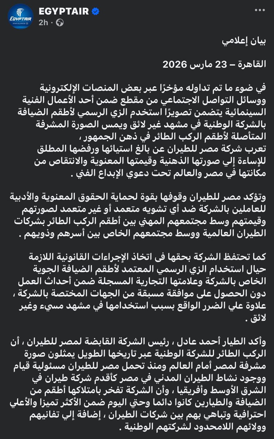 مصر للطيران تهيب بصناع المحتوى الفني والإعلامي ضرورة الرجوع إليها قبل استخدام اسمها أو العلامة التجارية أو الزي الرسمي الخاص بها في أي أعمال فنية