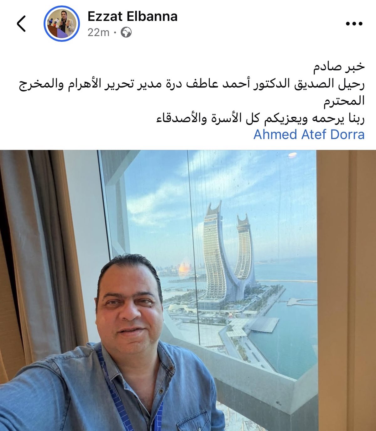 كما أعلن أيضًا، عزت البنا، خبر وفاة المخرج أحمد عاطف درة ، خلال منشور عبر حسابه الشخصي بموقع فيسبوك قائلاً: "خبر صادم رحيل الصديق الدكتور أحمد عاطف درة مدير تحرير الأهرام والمخرج المحترم، ربنا يرحمه ويعزيكم كل الأسرة والأصدقاء".