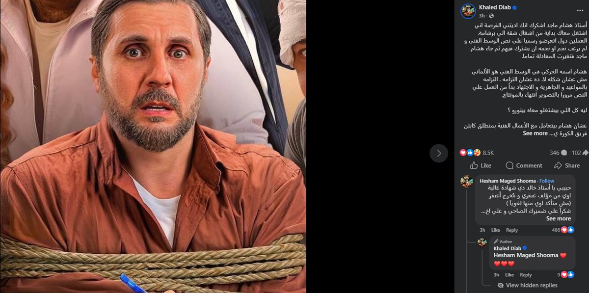 واختتم دياب حديثه مؤكدًا أن هشام ماجد ليس مجرد كوميديان، بل ممثل محترف قادر على تقديم أدوار جادة ومختلفة ستفاجئ الجمهور، مشددًا على أن كل من عمل معه يكنّ له محبة كبيرة، مؤكدًا أن منشوره لا يحمل أي مبالغة، قائلًا:" هشام يعني القلب الابيض و السلكان كله.هشام مش كوميديان محترف لأ ده ممثل متكامل محترف يعني أوعدكم هاتشوفوه في ادوار جد جدا هاتكسر الدنيا.اخيرا مفيش حد اشتغل معاه إلا بيحبه جدا و أنا أولهم .…..ملحوظة : هذا البوست لايحمل ذرة مبالغة...".