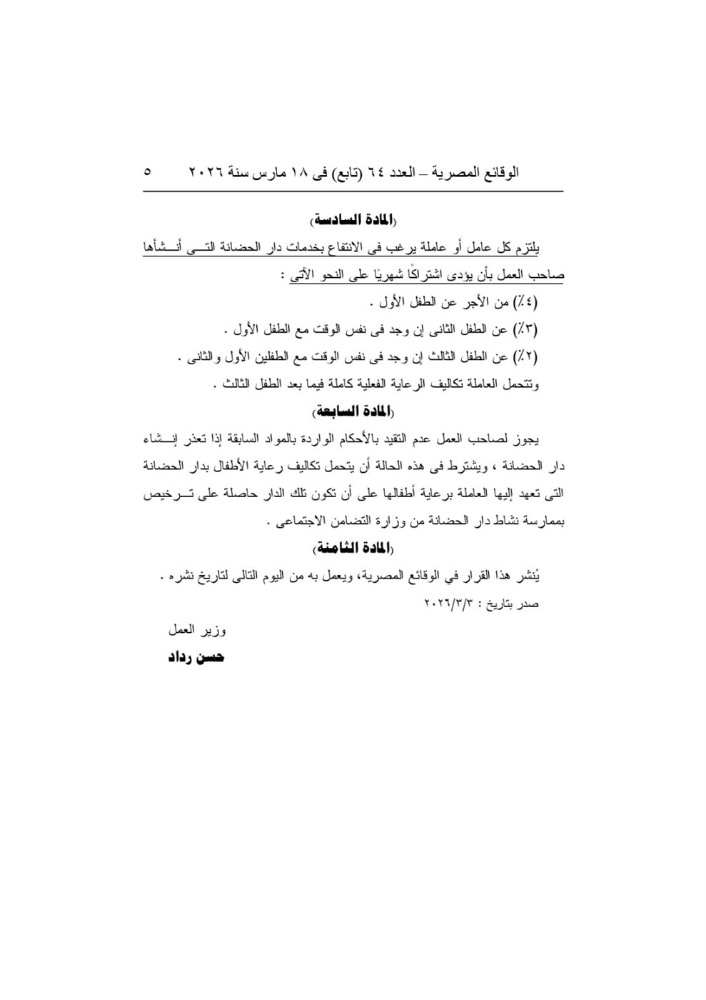 أصدر وزير العمل حسن رداد قرارًا وزاريًا بشأن تحديد القواعد والضوابط المنظمة لدور الحضانة التابعة لمنشآت العمل، في إطار تنظيم رعاية أطفال العاملات وضمان توفير بيئة مناسبة لهم، بالتنسيق مع وزارة التضامن الاجتماعي والمجلس القومي للطفولة والأمومة، وبعد العرض على المجلس الأعلى للتشاور الاجتماعي.