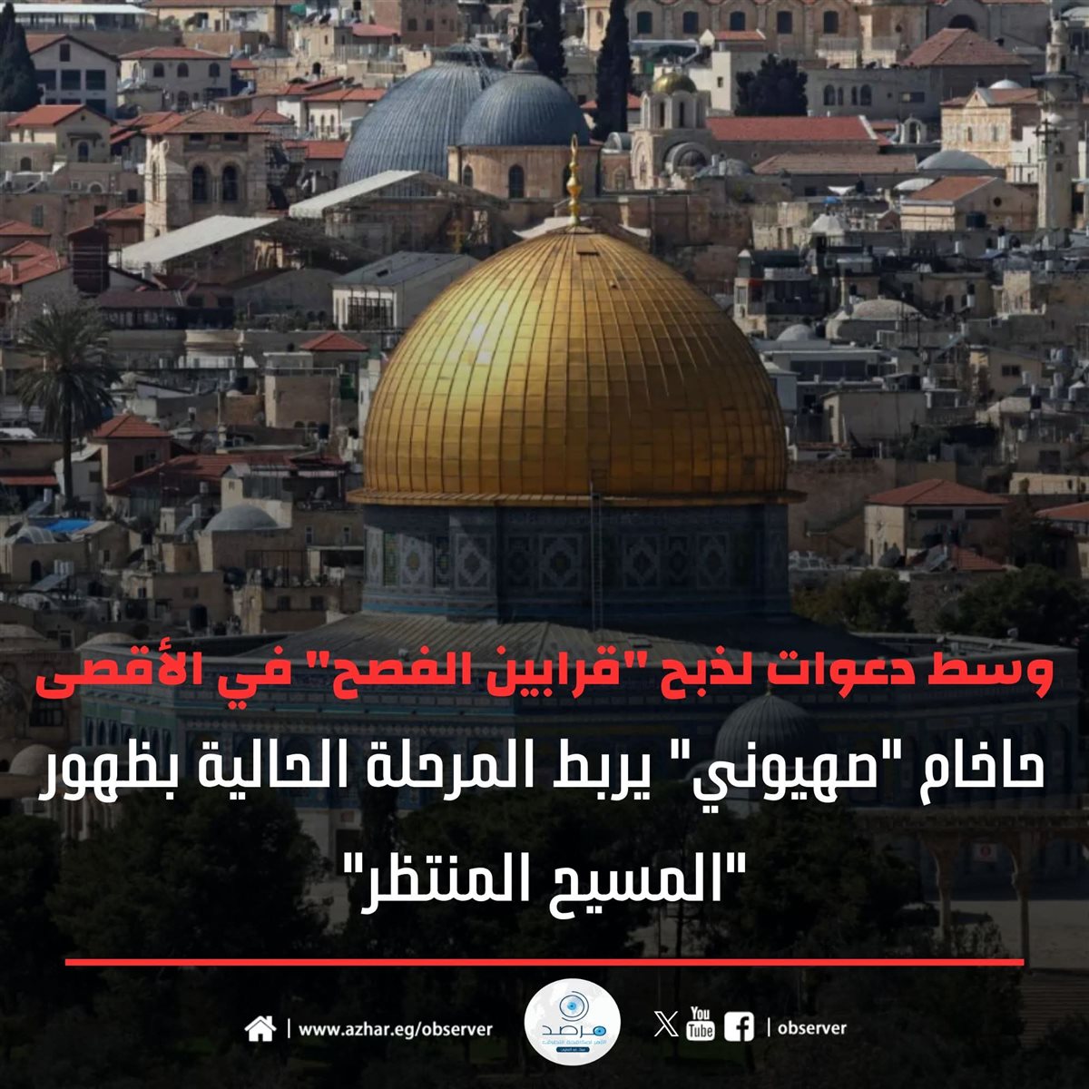 وفي هذا الصدد، يحذر مرصد الأزهر لمكافحة التطرف من تجاوز جماعات الهيكل المزعوم الخطوط الحمراء، إذ يمثل الانتقال من الدعاء لإعادة بناء الهيكل إلى المطالبة الفعلية بتجهيز "الأغنام" لذبحها في الأقصى ذروة الاستفزاز، لاسيما أن هذه الجماعات تعتبر أن ذبح القربان هو الإعلان الفعلي عن سيادتها على المسجد. كما يشير المرصد إلى أن رؤية الجماعات المتطرفة الصراعات العسكرية الحالية كـ "مخاض" ضروري لبناء الهيكل، يمنح الحرب غطاء قدسيًا يتجاوز الأهداف السياسية.