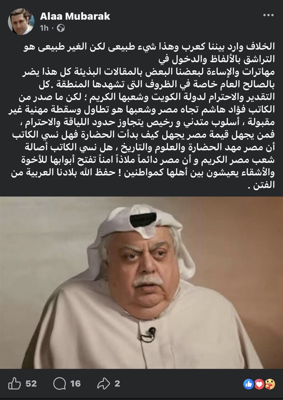 شن علاء مبارك نجل الرئيس الراحل محمد حسني مبارك هجومًا حادًا على الكويتي فؤاد الهاشم كاتب المقال المسيء لمصر، واصفًا ما صدر منه في حق مصر بـ"السقطة المهنية غير المقبولة"، وذلك خلال منشور عبر حسابه الشخصي بموقع التواصل الإجتماعي الأشهر “فيسبوك”.