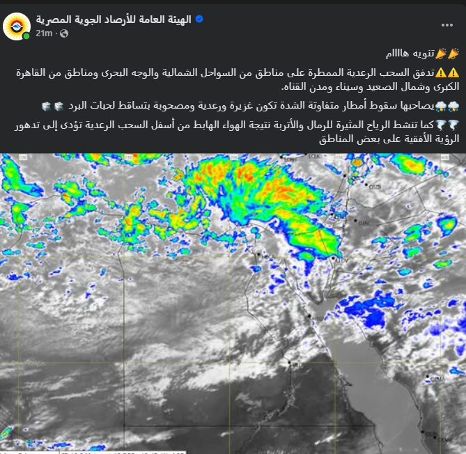 أصدرت الهيئة العامة للأرصاد الجوية تنويهًا عاجلًا عبر صفحتها الرسمية على موقع فيسبوك، بشأن حالة الطقس المتقلبة التي تشهدها البلاد خلال الساعات القادمة.