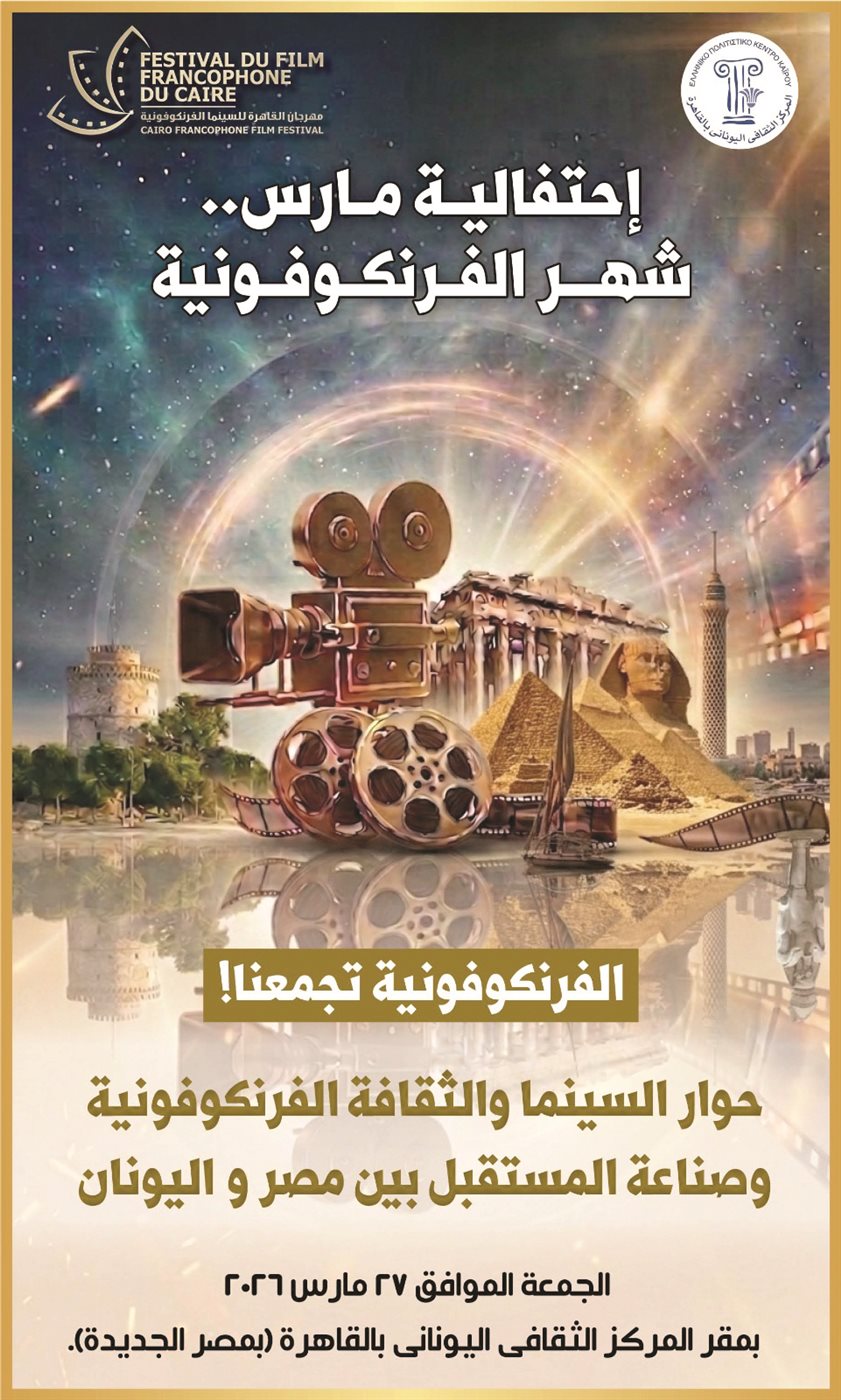 فى إطار الاحتفالات باليوم العالمى للفرنكوفونية وشهر مارس الذى يعد شهراً عالمياً للاحتفاء بالثقافة الفرنكوفونية، أعلن مهرجان القاهرة للسينما الفرنكوفونية، برئاسة الكاتب الصحفى والناقد السينمائى الدكتور ياسر محب، عن تنظيم احتفالية سينمائية وثقافية خاصة، احتفاءً باليوم العالمى للفرنكوفونية ٢٠٢٦، تقام اليوم الجمعة ٢٧ مارس بمقر المركز الثقافى اليونانى بالقاهرة، بمصر الجديدة.