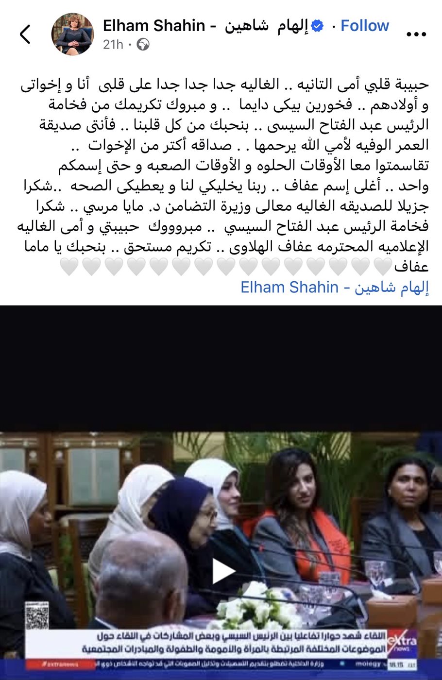 ونشرت إلهام شاهين عبر حسابها الرسمي على الموقع الأشهر فيسبوك رسالة مؤثرة، عبّرت فيها عن عمق العلاقة التي تربطها بالإعلامية عفاف الهلاوي، مؤكدة أنها ليست مجرد صديقة للأسرة، بل تمثل لها “أمًا ثانية” لها ولأسرتها، خاصة بعد علاقة الصداقة القوية التي جمعتها بوالدتها الراحلة.