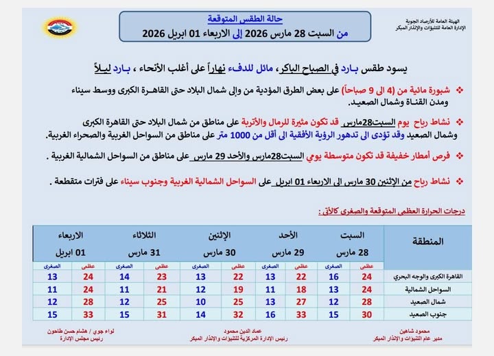 حالة الطقس.. توقعت الهيئة العامة للأرصاد الجوية، أن حالة الطقس الأيام المقبلة طول الأسبوع الجديد، سوف تظل الأجواء باردة خلال ساعات الصباح الباكر، يميل للدفء نهارًا على أغلب أنحاء البلاد، بينما يكون باردًا ليلًا، وذلك خلال الفترة من السبت 28 مارس حتى الأربعاء 1 أبريل 2026.