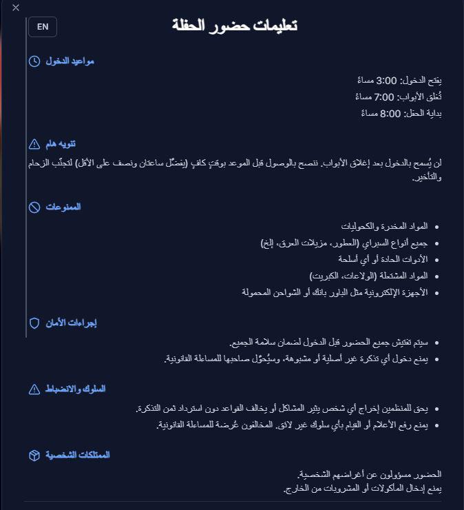 كما تحتفظ الجهة المنظمة بحقها في اتخاذ الإجراءات اللازمة ضد أي سلوك مخالف، بما في ذلك إخراج المخالفين دون استرداد قيمة التذكرة، لضمان خروج الحفل بصورة تليق بالجمهور والتنظيم.