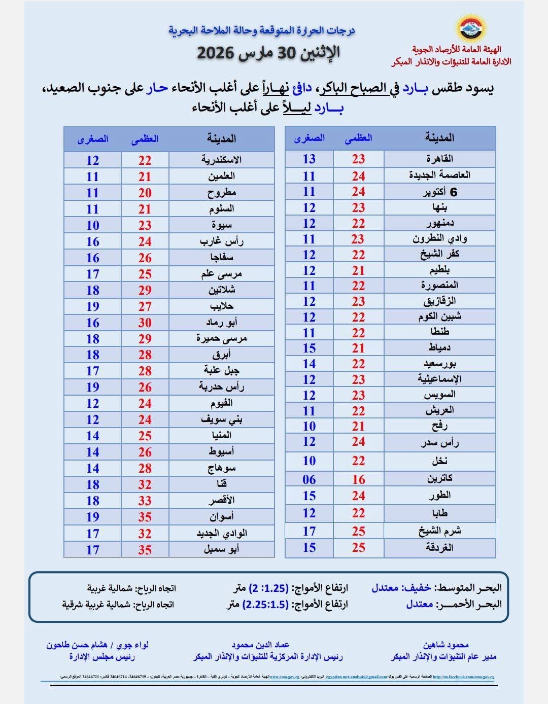 أما عن درجات الحرارة الصغرى والعظمى المتوقعة فجاءت كالآتي..