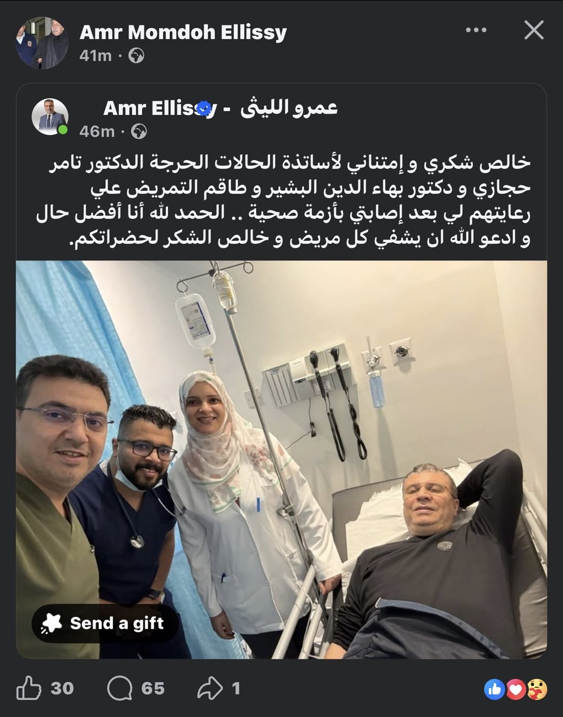 قال عمرو الليثي: “خالص شكري و إمتناني لأساتذة الحالات الحرجة الدكتور تامر حجازي و دكتور بهاء الدين البشير و طاقم التمريض علي رعايتهم لي بعد إصابتي بأزمة صحية"
