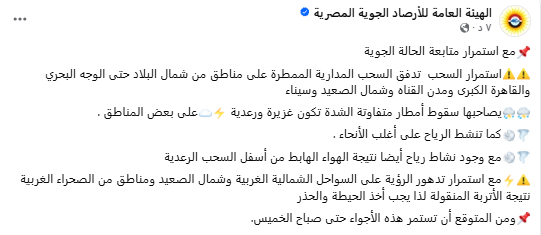 وأوضحت الهيئة أن صور الأقمار الصناعية تشير إلى استمرار تدفق السحب المدارية الممطرة على مناطق واسعة من شمال البلاد، تمتد إلى الوجه البحري والقاهرة الكبرى ومدن القناة وشمال الصعيد وسيناء، يصاحبها سقوط أمطار متفاوتة الشدة، قد تكون غزيرة ورعدية على بعض المناطق.