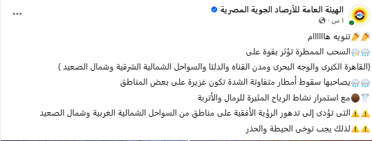 نشرت الهيئة العامة للأرصاد الجوية منشورًا عاجلًا على صفحتها الرسمية على موقع فيسبوك، تحذر فيه من استمرار تأثير السحب الممطرة على عدة مناطق بالجمهورية.