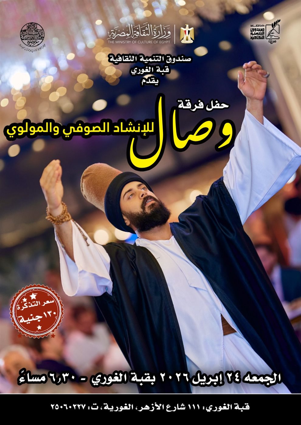 يقدم مركز إبداع قبة الغوري بحي الأزهر – التابع لقطاع صندوق التنمية الثقافية – حفلًا لفرقة "وصال" للإنشاد الصوفي والمولوي، وذلك في تمام الساعة السادسة والنصف مساء يوم الجمعة الموافق 24 أبريل.