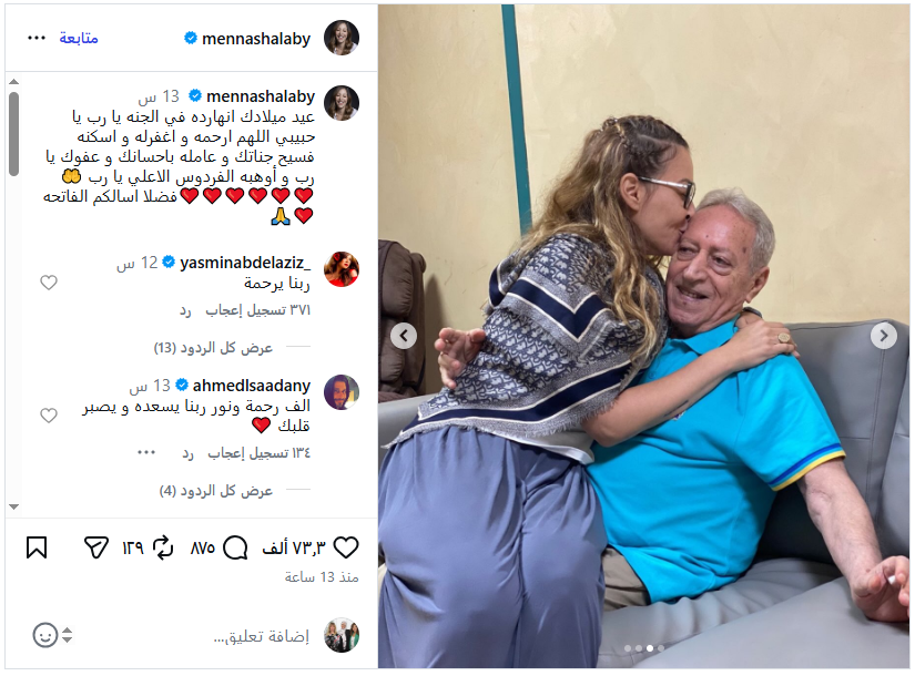 أحيت الفنانة منة شلبي ذكرى ميلاد والدها الراحل برسالة مؤثرة عبر حسابها على إنستجرام، حيث نشرت صورًا جمعتهما وطلبت من جمهورها الدعاء له وقراءة الفاتحة، وذلك بعد أيام من تلقيها العزاء وسط حضور واسع من نجوم الفن.