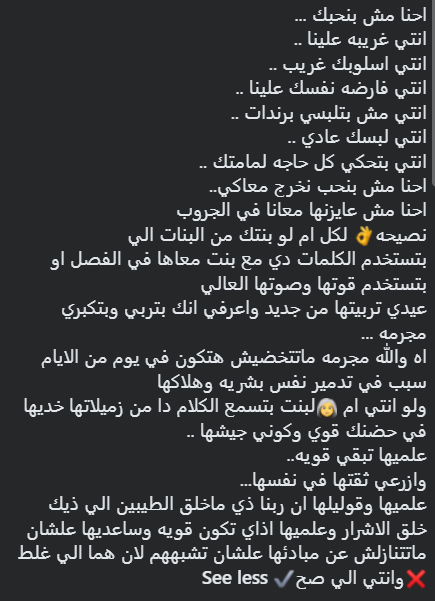 وتابعت: "نصيحه لكل أم لو بنتك من البنات اللي بتستخدم الكلمات دي مع بنت معاها في الفصل أو بتستخدم قوتها وصوتها العالي عيدي تربيتها من جديد واعرفي إنك بتربي وبتكبري مجرمة...اه والله مجرمة ماتتخضيش هتكون في يوم من الايام سبب في تدمير نفس بشريه وهلاكها".