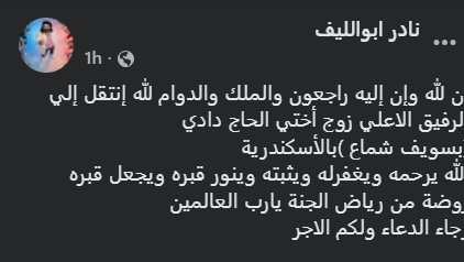 قال نادر أبو الليف: “إن لله وإن إليه راجعون والملك والدوام لله انتقل إلي الرفيق الاعلي زوج أختي الحاج دادي، بسويف شماع بالأسكندرية، الله يرحمه ويغفرله ويثبته وينور قبره ويجعل قبره روضة من رياض الجنة يارب العالمين، رجاء الدعاء ولكم الاجر”.