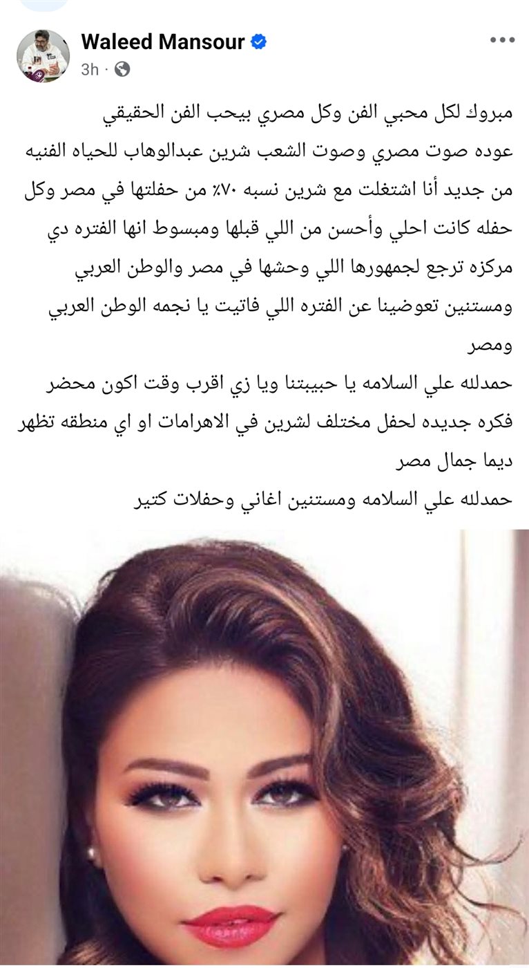 عبر منظم الحفلات وليد منصور عن سعادته بعودة الفنانة شيرين عبدالوهاب إلى الساحة الفنية، مؤكدًا أنها تمثل “صوت مصر وصوت الشعب”.