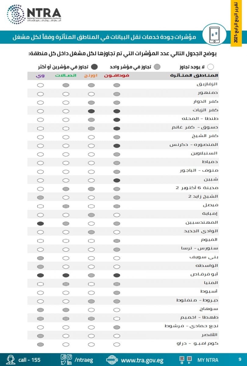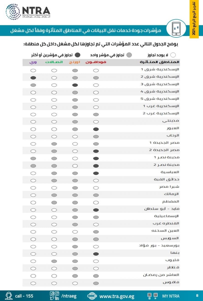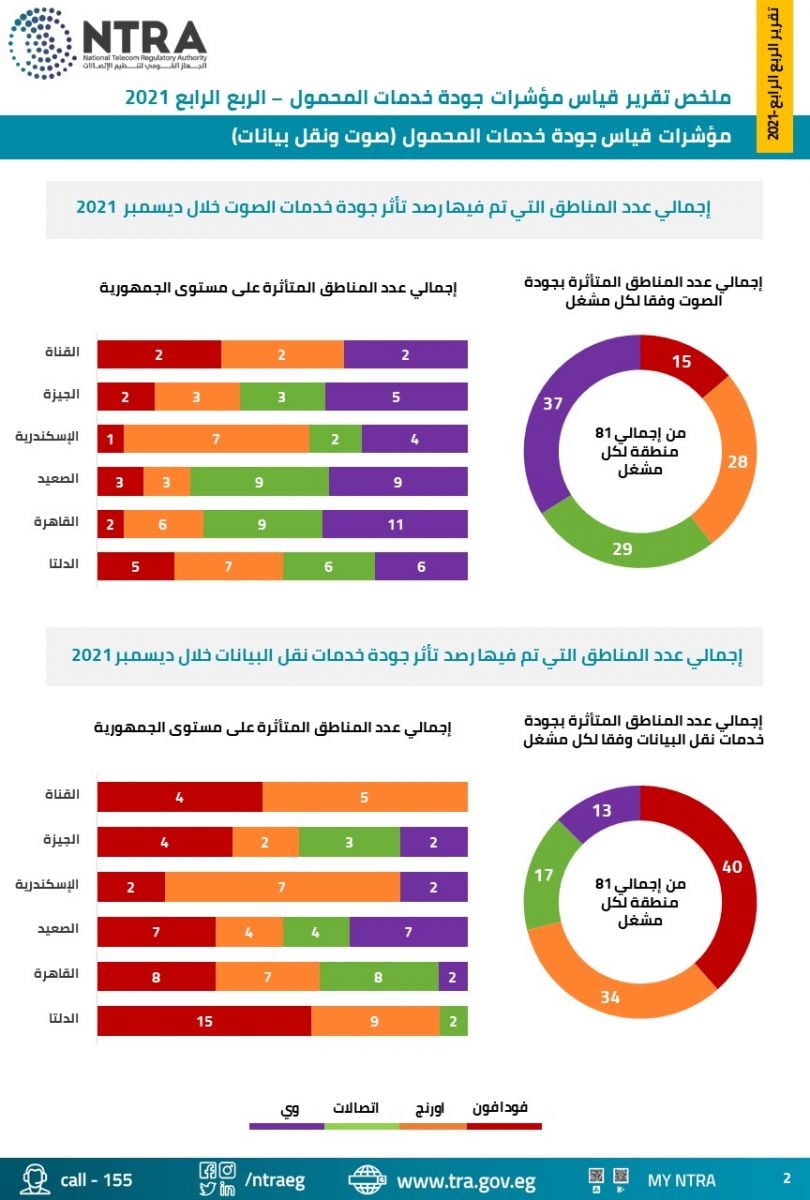 اتصالات: من أصل ٨١ منطقة (مدينة وحي) تم إجراء اختبارات القياس عليها تم رصد عدد 29 منطقة تعاني من سوء جودة خدمات الصوت، وعلى رأسها القاهرة والصعيد والدلتا، حيث تم رصد 36 تجاوزًا في 29 منطقة خلال شهر ديسمبر 2021 مقارنة بعدد 43 تجاوزًا في 32 منطقة خلال شهر أكتوبر 2021.