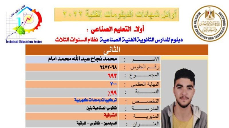 • الطالب محمد نجاح عبد الله محمد إمام ( تخصص تركيبات ومعدات كهربية ) بمدرسة فاقوس الصناعية بنين حصل علي المركز الثاني على مستوى الجمهورية بدبلوم المدارس الثانوية الفنية الصناعية نظام السنوات الثلاث.