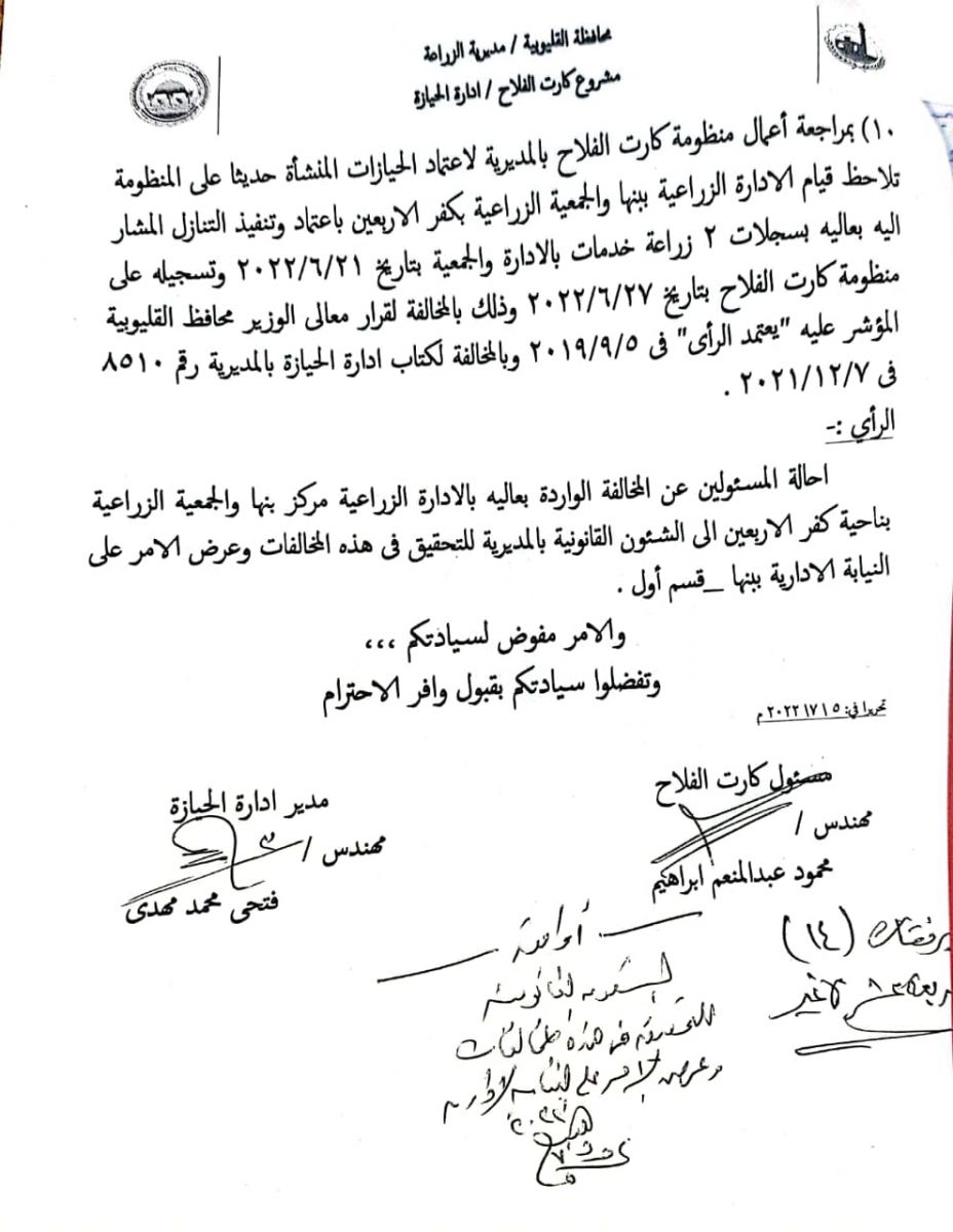 بمراجعة أعمال منظومة كارت الفلاح بالمديرية لاعتماد الحيازات المنشأة حديثا على المنظومة تلاحظ قيام الادارة الزراعية ببنها والجمعية الزراعية بكفر الاربعين باعتماد وتنفيذ التنازل المشار اليه بعاليه بسجلات ۲ زراعة خدمات بالادارة والجمعية بتاريخ ٢٠٢٢/٦/٢١ وتسجيله على منظومة كارت الفلاح بتاريخ ٢٠٢٢/٦/٢٧ وذلك بالمخالفة لقرار محافظ القليوبية المؤشر عليه "يعتمد الرأى" في ٢٠١٩/9/5 وبالمخالفة لكتاب ادارة الحيازة بالمديرية رقم 8510