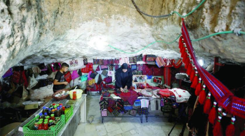 هنا صابون وزيت الزيتون وفي الجانب الآخر رصصن أعمالهن اليدوية الخاصة بالتطريز، وبلمسات فلسطينية حولوا الكهف إلى معرض لا مثيل له، ووضعن منتجاتهن يكدحن لبيعها، وينفقن على أبنائهن.