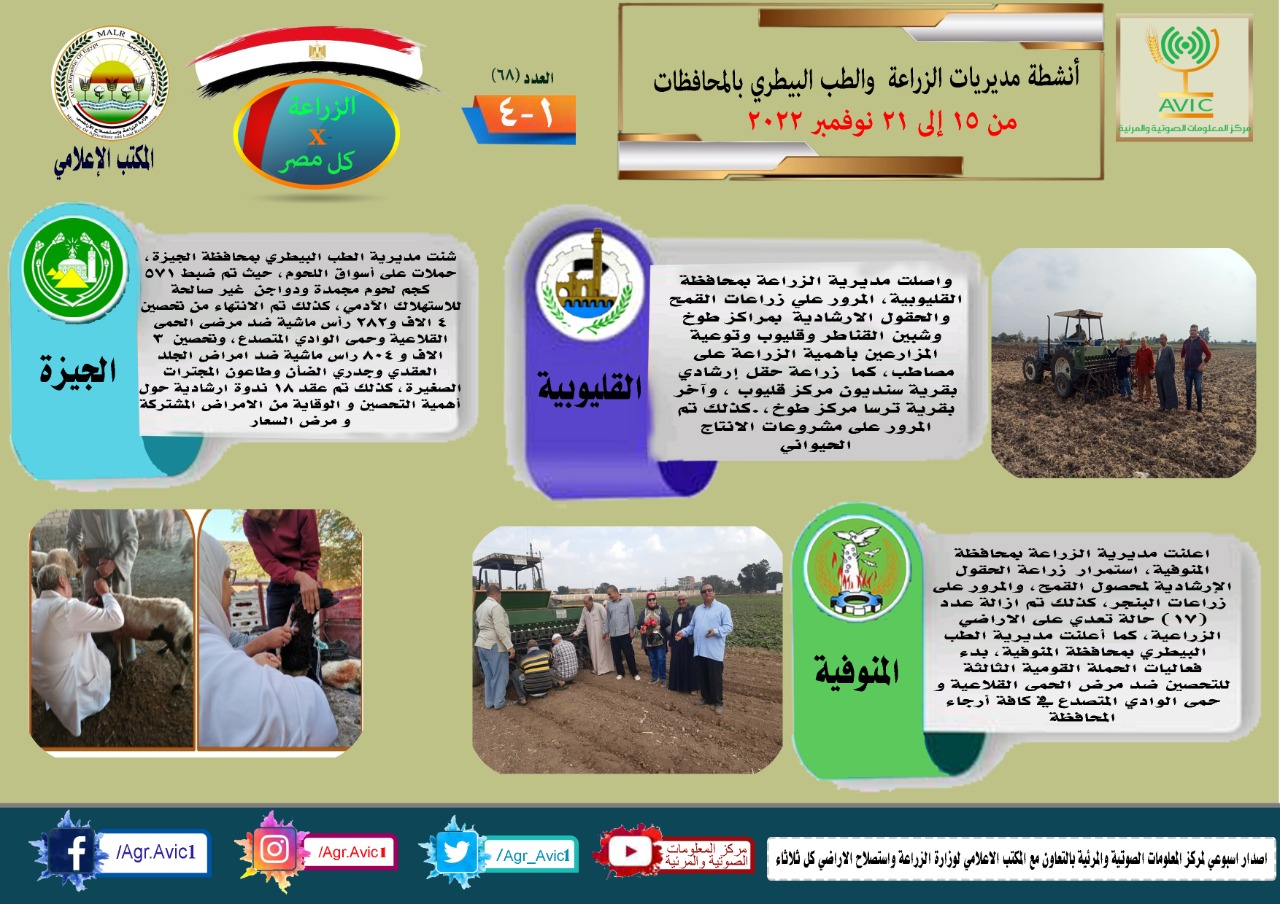 ويوضح الجهود والأنشطة التي تقوم بها مديريات الزراعة والطب البيطري بمحافظات الجمهورية خلال الفترة من ١٥ إلى ٢١ نوفمبر الجاري.