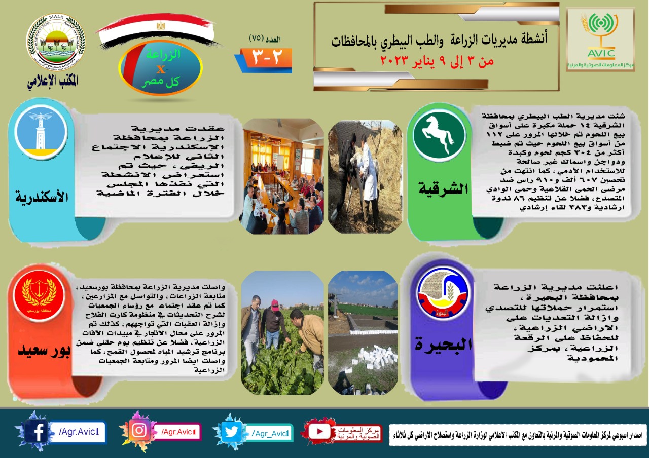 أصدر مركز المعلومات الصوتية والمرئية التابع لوزارة الزراعة واستصلاح الأراضي، والمكتب الإعلامي للوزارة، العدد رقم ٧٥ من إصدار: "الزراعة في كل مصر" بالإنفوجراف والفيديو، يوضح الجهود والأنشطة التي تقوم بها مديريات الزراعة والطب البيطري بمحافظات الجمهورية خلال الفترة من ٣ وحتى ٩ يناير الجاري الجاري.