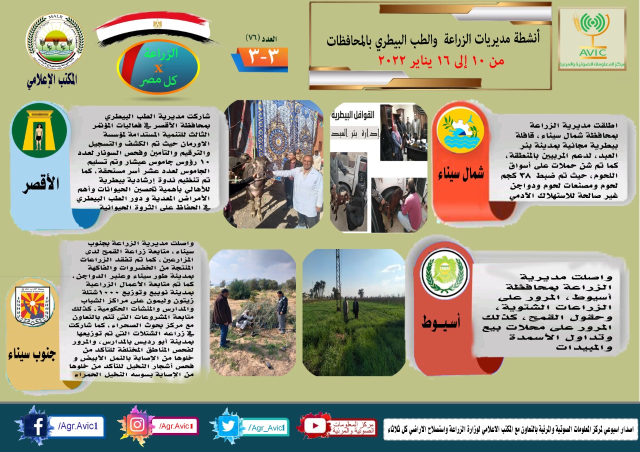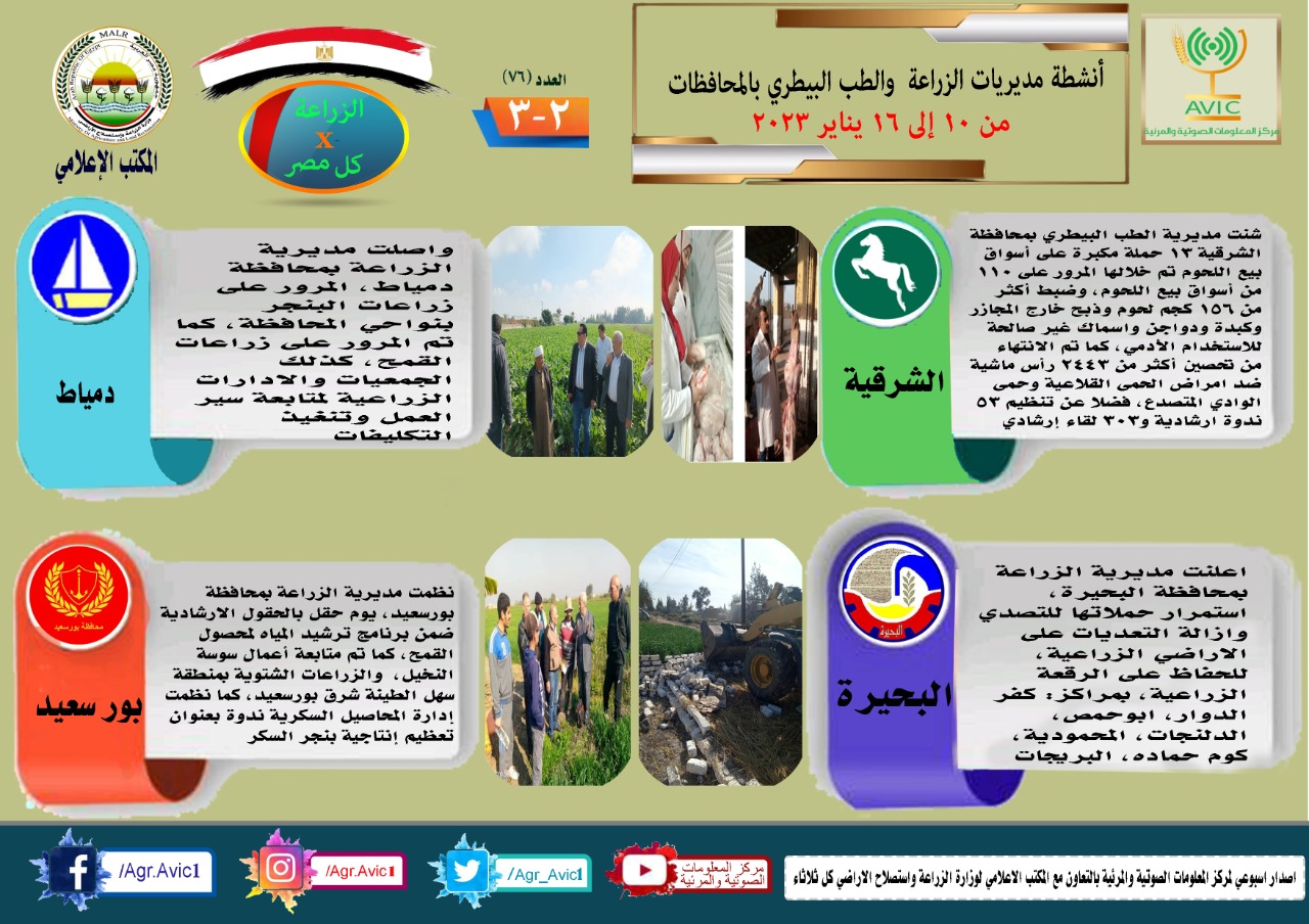 يوضح الجهود والأنشطة التي تقوم بها مديريات الزراعة والطب البيطري بمحافظات الجمهورية خلال الفترة من ١٠ وحتى ١٦ يناير الجاري.