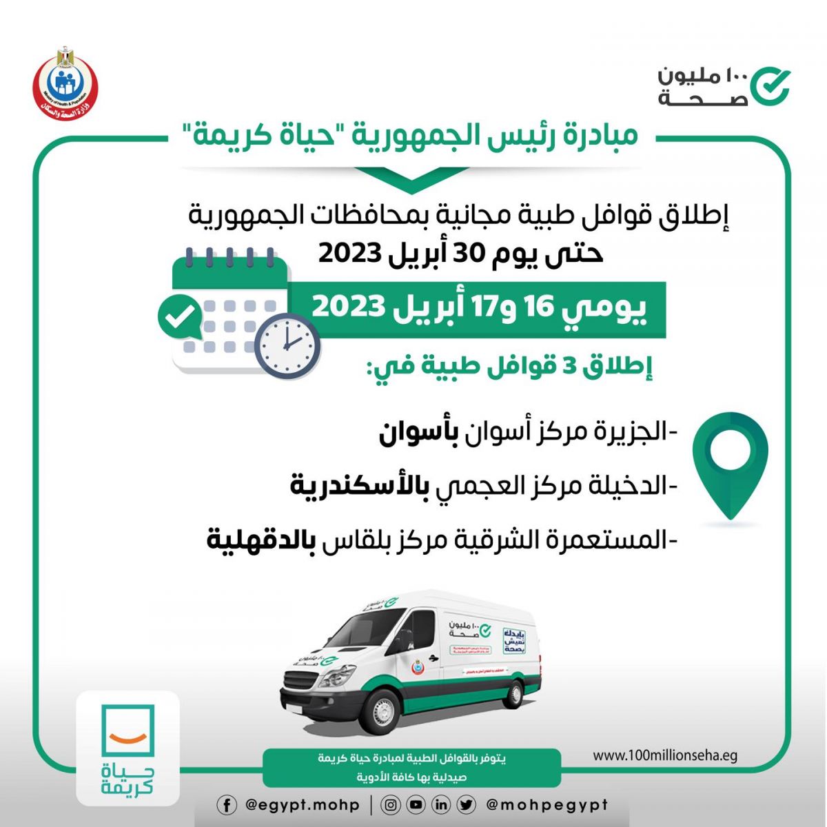 أعلنت وزارة الصحة والسكان المصرية إطلاق 3 قوافل طبية اليوم وغدًا، ضمن مبادرة رئيس الجمهورية حياة كريمة، للكشف والعلاج مجانًا في التخصصات الطبية المختلفة.