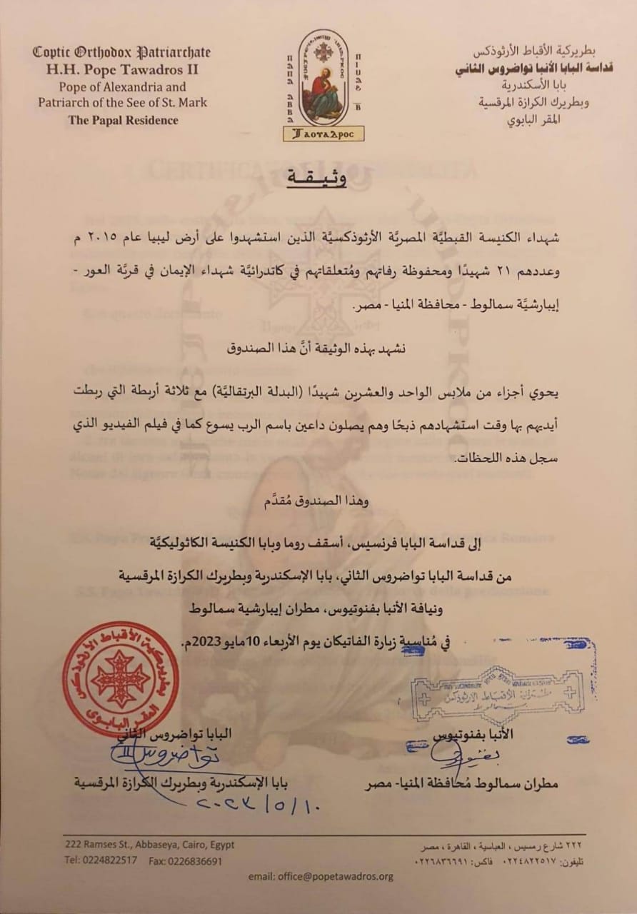 نصت الوثيقة: "نشهد بهذه الوثيقة أن هذا الصندوق يحوي أجزاء من ملابس الواحد والعشرين شهيدًا (البدلة البرتقالية) مع ثلاثة أربطة التي ربطت أيديهم، وهذا الصندوق مقدم إلى قداسة الباب فرنسيس، أسقف روما وبابا الكنيسة الكاثوليكية من البابا تواضروس الثاني، بابا الإسكندرية وبطريرك الكرازة المرقسية ونيافة الأنبا بفنوتيوس، مطران إيبارشية سمالوط في مناسبة زيارة الفاتيكان يوم الأربعاء 10 مايو 2023 ميلادي".