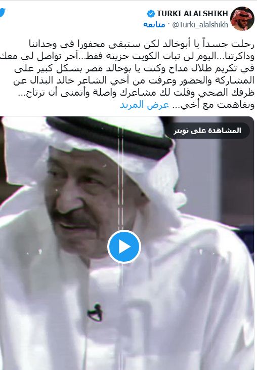 وحرص عدد من المشاهير على نعي الفنان الراحل، كان من أبرزهم تركي آل الشيخ، رئيس هيئة الترفيه في المملكة العربية السعودية، حيث مقطع فيديو للفنان الراحل قال بتعليق عليه: "رحلت جسداً يا أبو خالد لكن ستبقى محفورا في وجداننا وذاكرتنا…اليوم لن تبات الكويت حزينة فقط…آخر تواصل لي معك في تكريم طلال مداح وكنت يا أبوخالد مصرا بشكل كبير على المشاركة والحضور وعرفت من أخي الشاعر خالد البذال عن ظرفك الصحي وقلت لك مشاعرك واصلة وأتمنى أن ترتاح…وتفاهمت مع أخي خالد على الاستعداد لتكريم الصوت الجريح في أكتوبر أو نوفمبر 2023 لكن إرادة الله سبقت كل شيء والحمدلله على كل حال…لن أنسى ملحمة وطن النهار سنة 1991…اليوم فقدنا فنان أصيل بهوية مميزة لا يشبه أحدا".