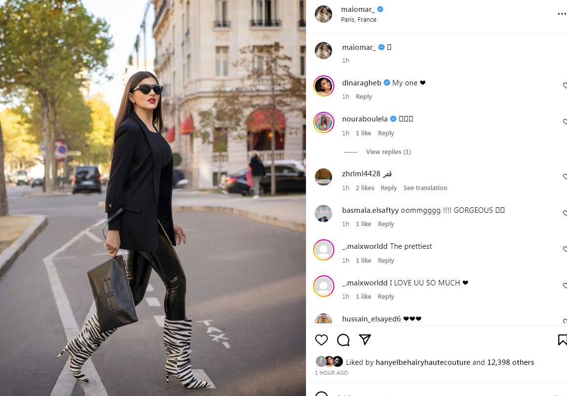 وبدت مي عمر بإطلالة جذابة، مواكبة لأحدث صيحات الموضة، حيث ارتدت بادي وعليه بليزر أسود ونسقت عليهما بنطالا أسود صمم من الجلد اللامع، فيما انتعلت هاف بوت بنقشة الزيبرا.