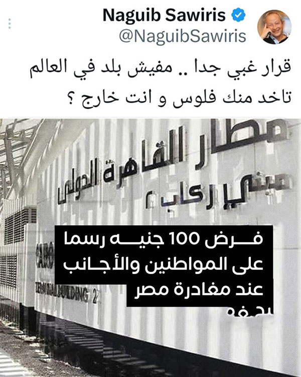 وقال ساويرس في تغريدته: قرار غبي جدًا.. مفيش بلد في العالم تاخد منك فلوس وأنت خارج؟.