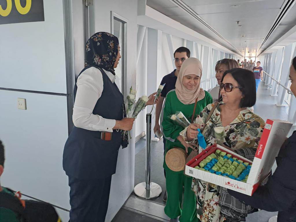 من جانبه وجه الطيار أحمد منصور التعليمات بحسن استقبال الطائرة الجديدة وتسهيل جميع إجراءات الوصول للسائحين، وبالفعل تم استقبال الطائره بتقليد رش المياه water salute، وتم استقبال السائحين بالورود وتوزيع الهدايا التذكارية، مع تمنيات فريق العمل بالمطار بقضاء إجازة ممتعة ورؤيتهم بالغردقة مرات أخرى.