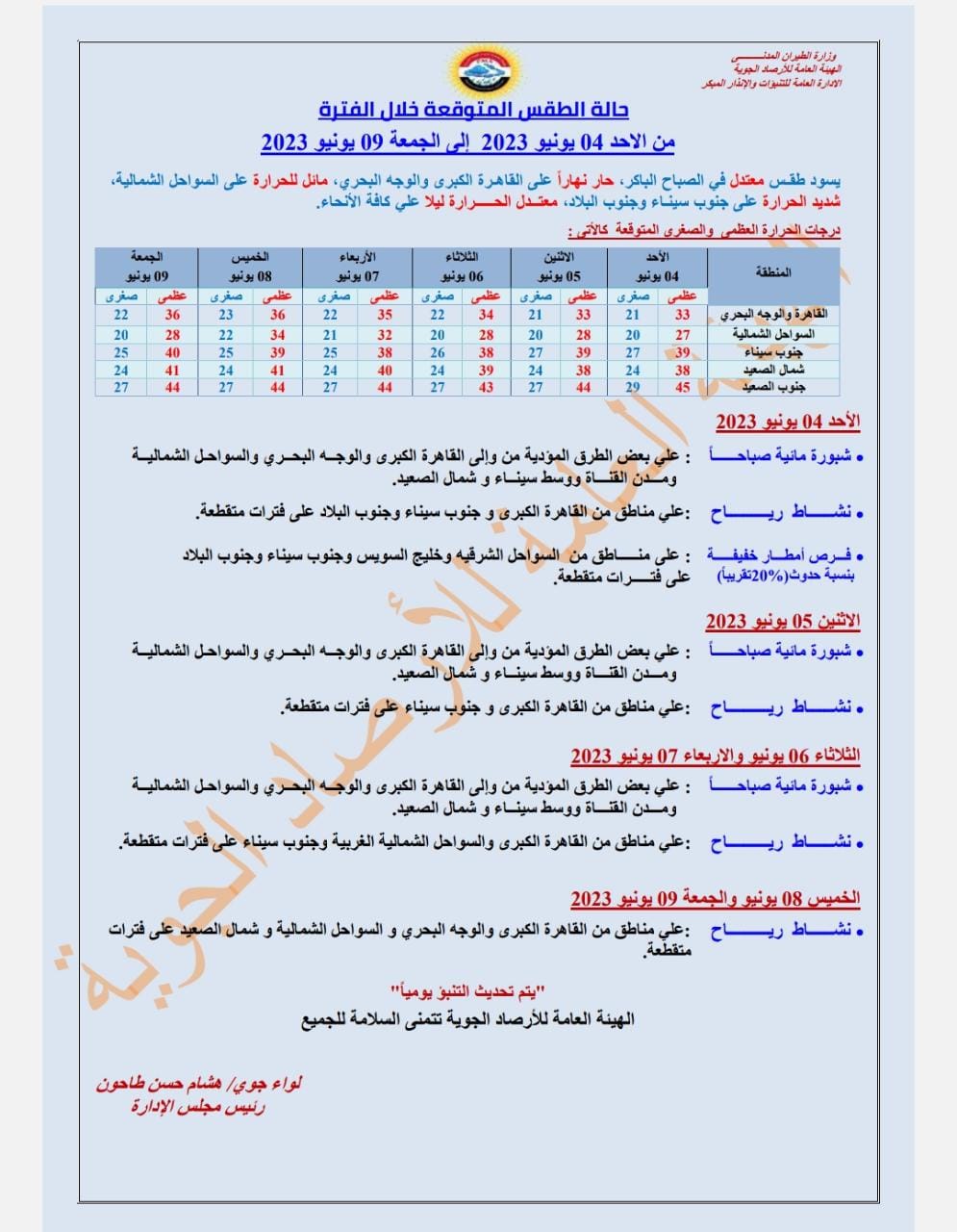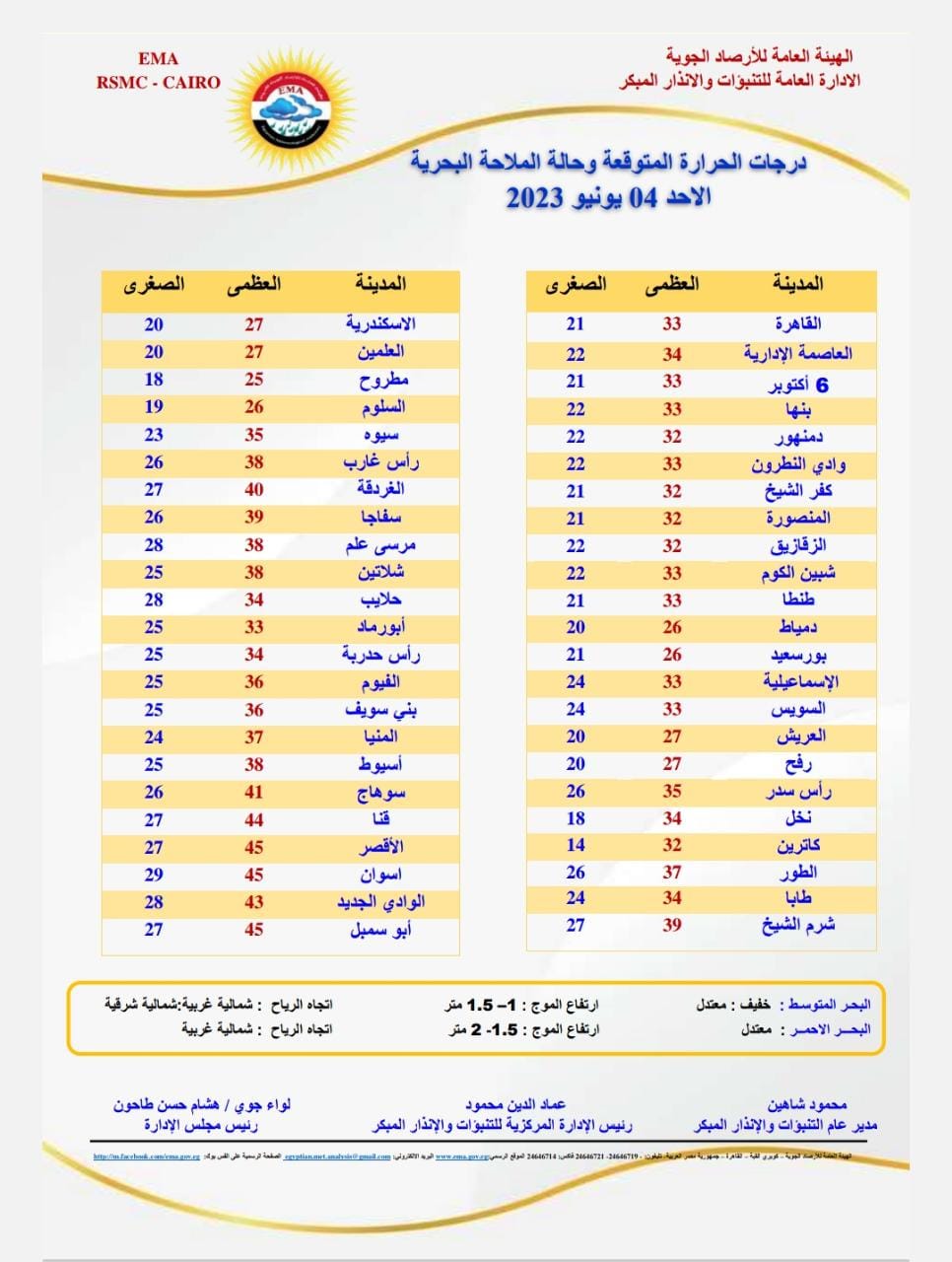 القاهرة العظمى 33 درجة والصغرى 21 درجة.