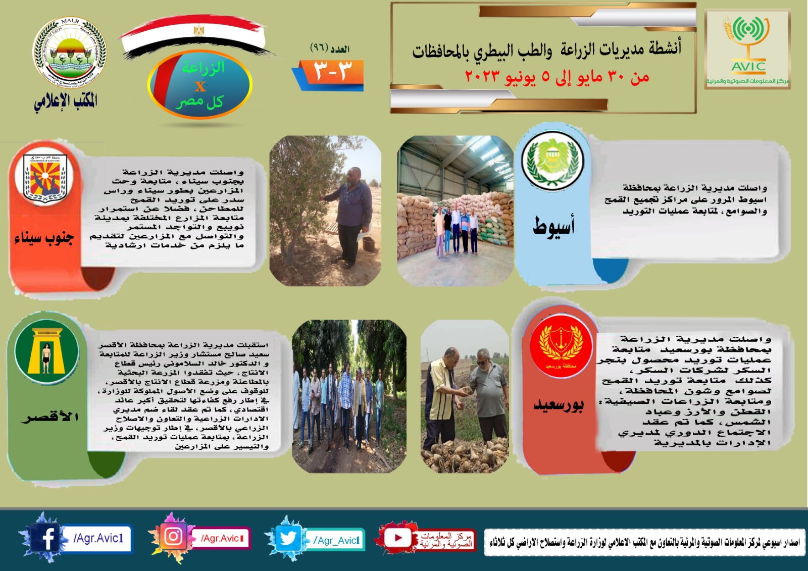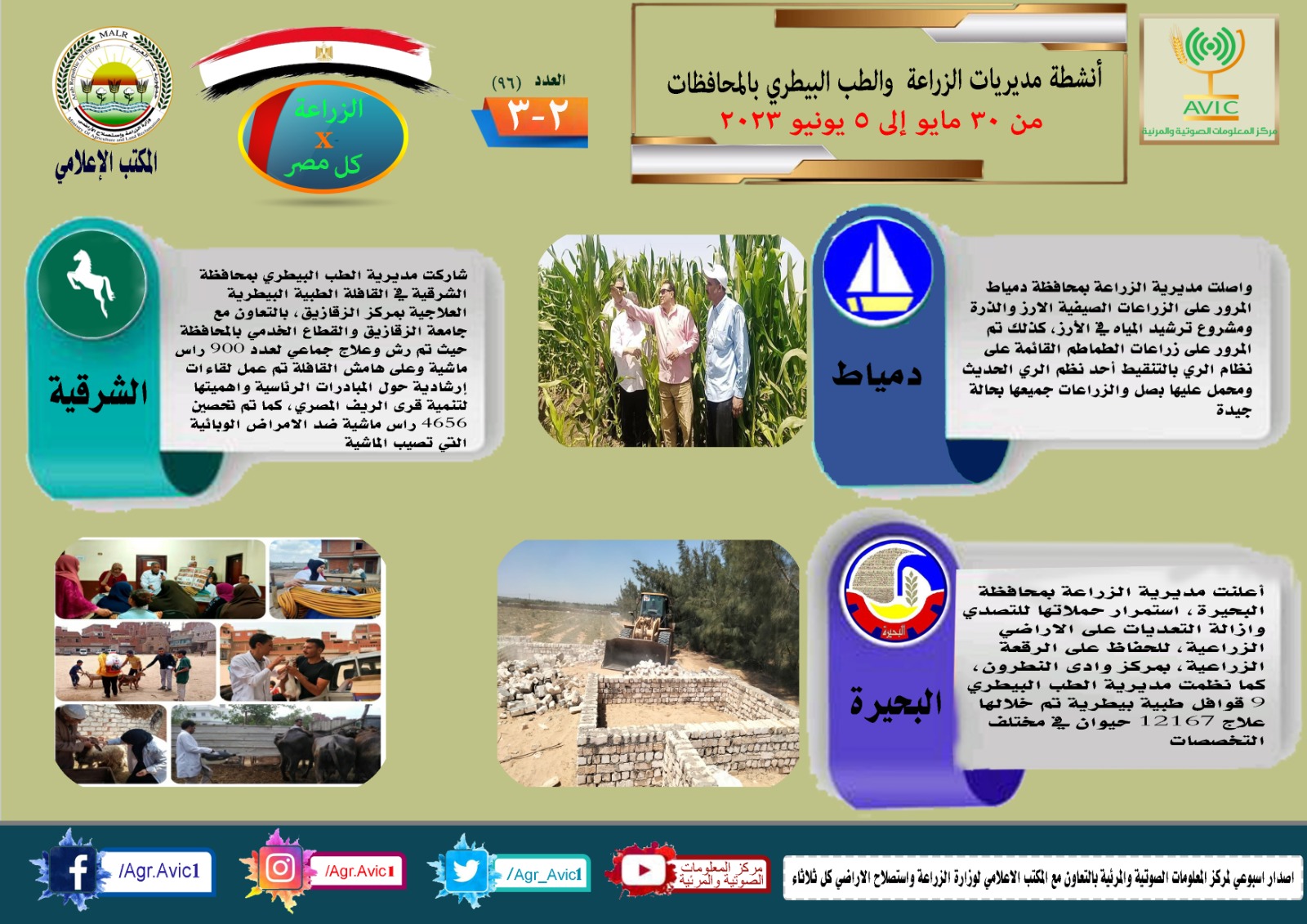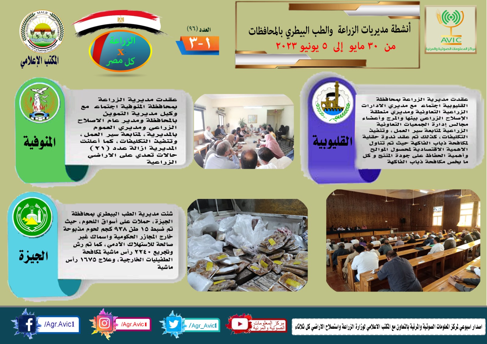أصدر مركز المعلومات الصوتية والمرئية التابع لوزارة الزراعة واستصلاح الأراضي، والمكتب الاعلامي للوزارة، العدد رقم ٩٦ من اصدار: "الزراعة في كل مصر" بالانفوجراف والفيديو، يوضح الجهود والانشطة التي تقوم بها مديريات الزراعة والطب البيطري بمحافظات الجمهورية خلال الفترة من ٣٠ مايو وحتى ٥ يونيو الجاري.