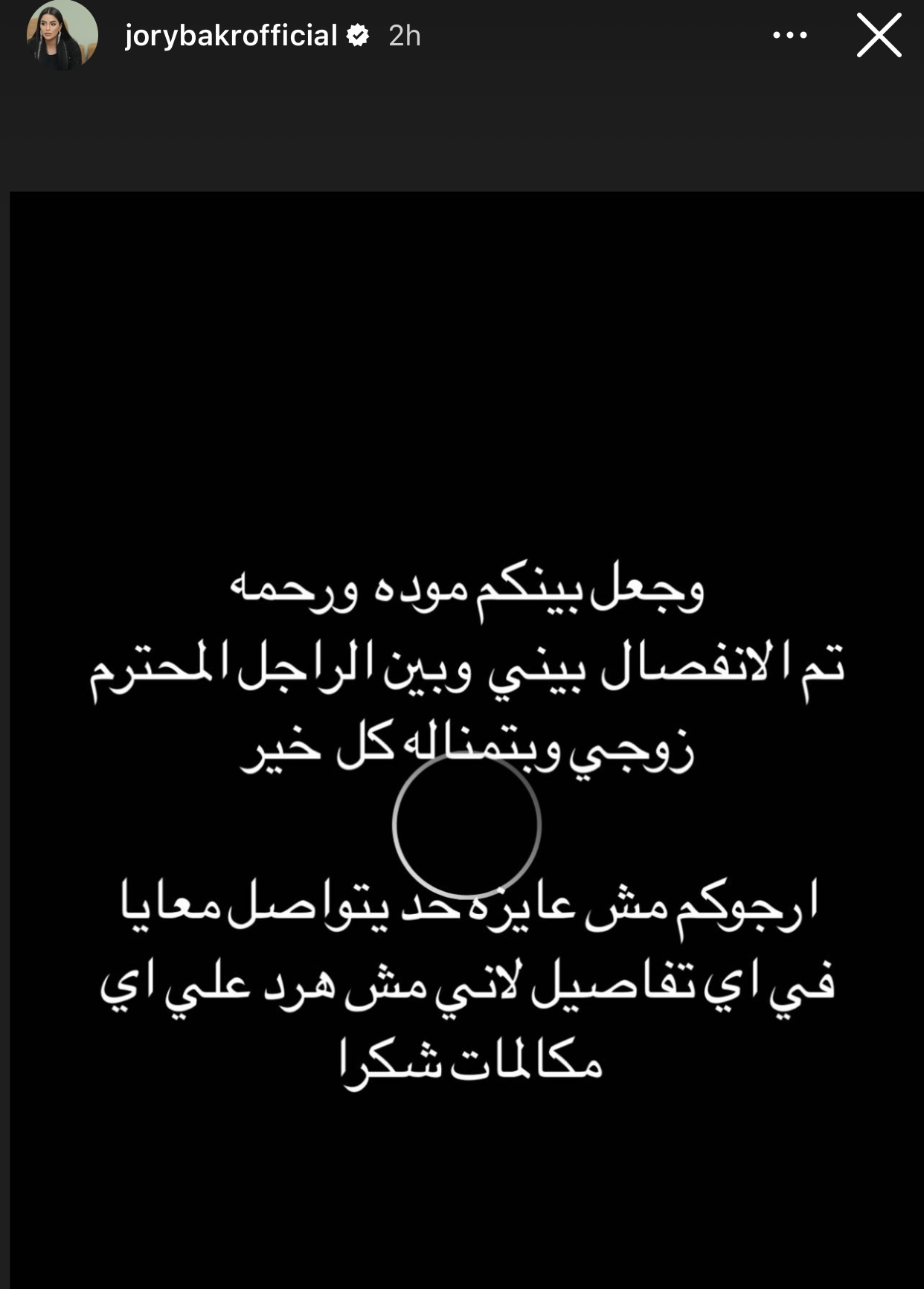 وكتب حساب جوري بكر عبر خاصية (الاستوري) بموقع "إنستجرام": وجعل بينكم مودة ورحمة، تم الانفصال بينى وبين الرجل المحترم زوجى، وبتمنى له كل خير".