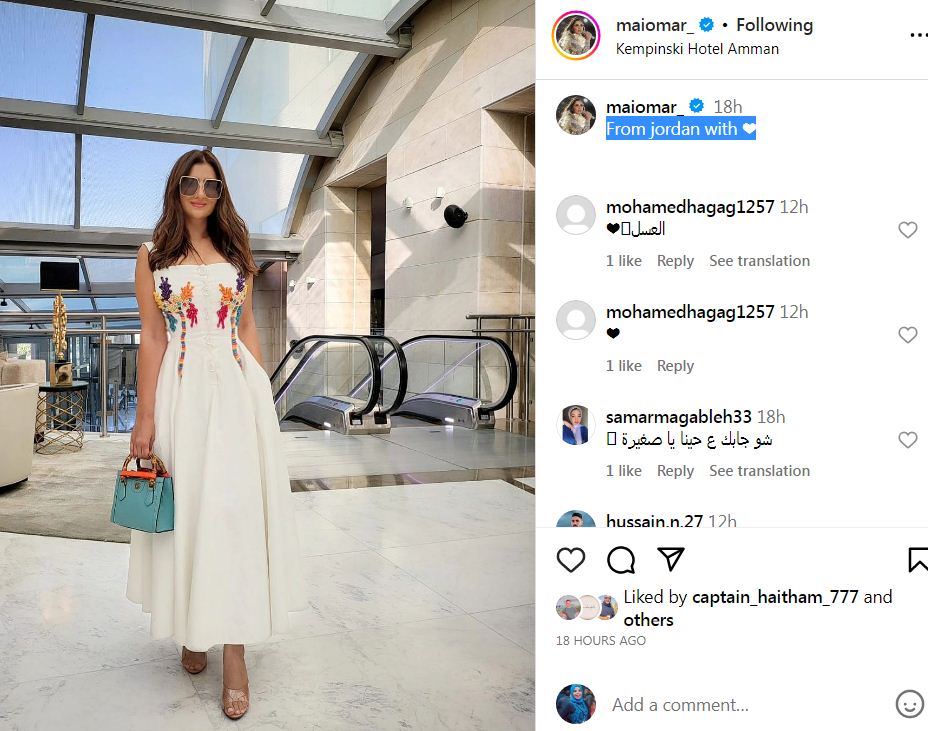 شاركت الفنانة مي عمر زوجة المخرج محمد سامي متابعيها بأحدث إطلالتها كالعادة عبر حسابها الشخصي بموقع تبادل الفيديوهات والصور الأشهر إنستجرام، وذلك أثناء تواجدها في الاردن.
