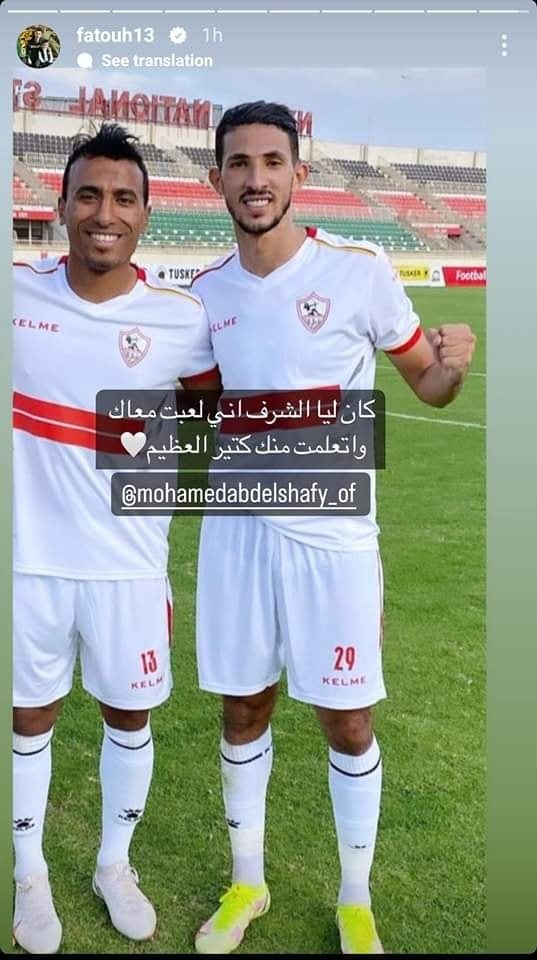و نشر أحمد فتوح عبر حسابه الرسمي بموقع التواصل الاجتماعى “إنستجرام”، رسالة: "كان ليا الشرف إنى لعبت معاك واتعلمت منك كتير"، مشيرًا إلى محمد عبدالشافى قائد الزمالك المعتزل.
