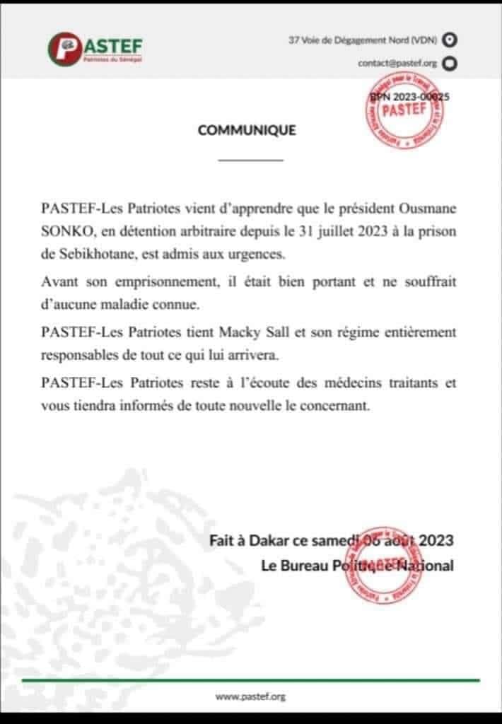 أعلن حزب باستيف، عن تدهور الحالة الصحية لمعارض السنغالي عثمان سونكو، ونقل إلي قسم الطوارئ.