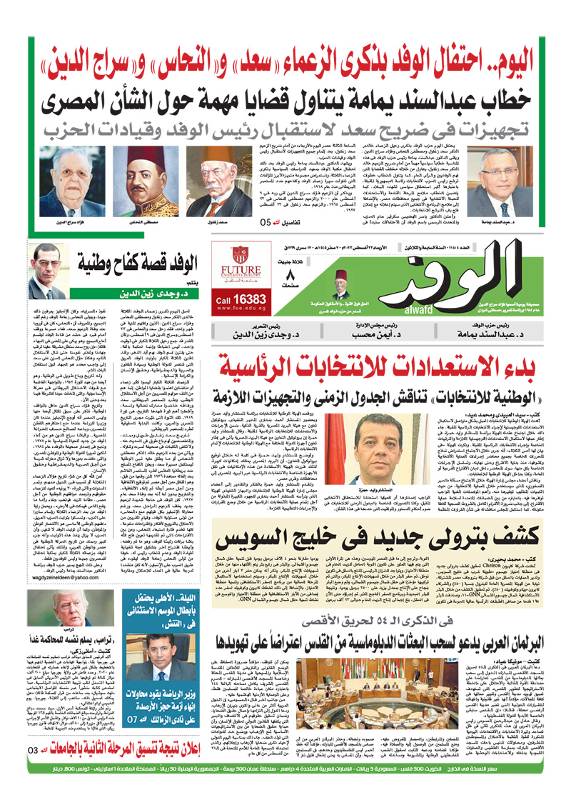 تنشر جريدة الوفد اليومية الورقية في عددها الصادر، غدًا الأربعاء، العديد من الموضوعات والتقارير الإخبارية المهمة، أبرزها: "اليوم.. احتفال الوفد بذكرى الزعماء "سعد" و"النحاس"و"سراج الدين".