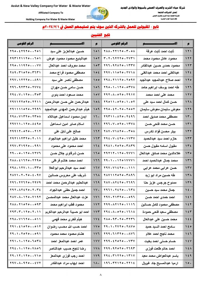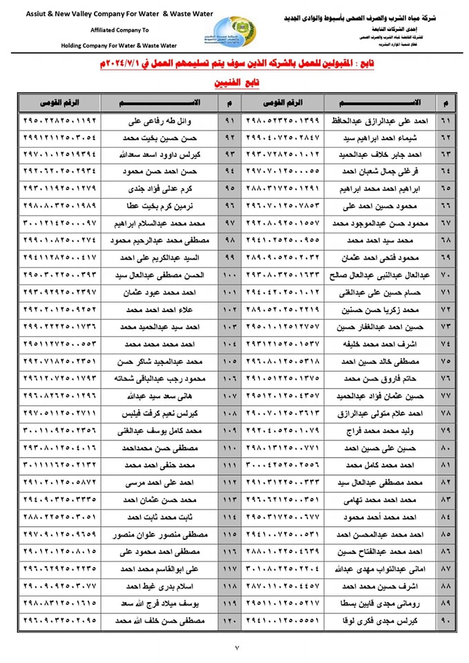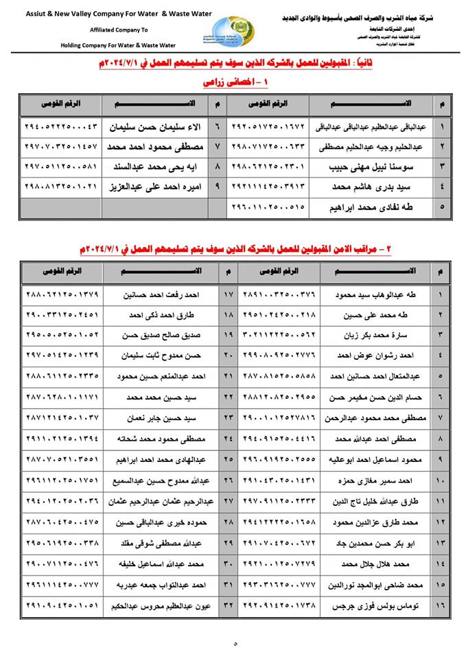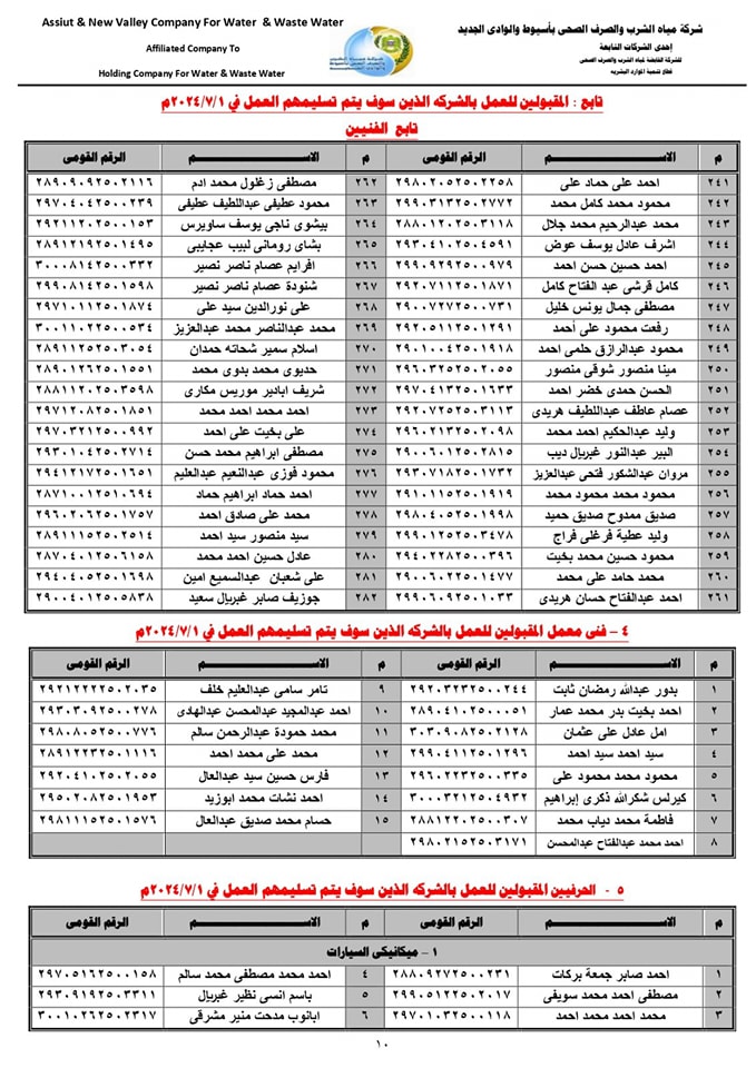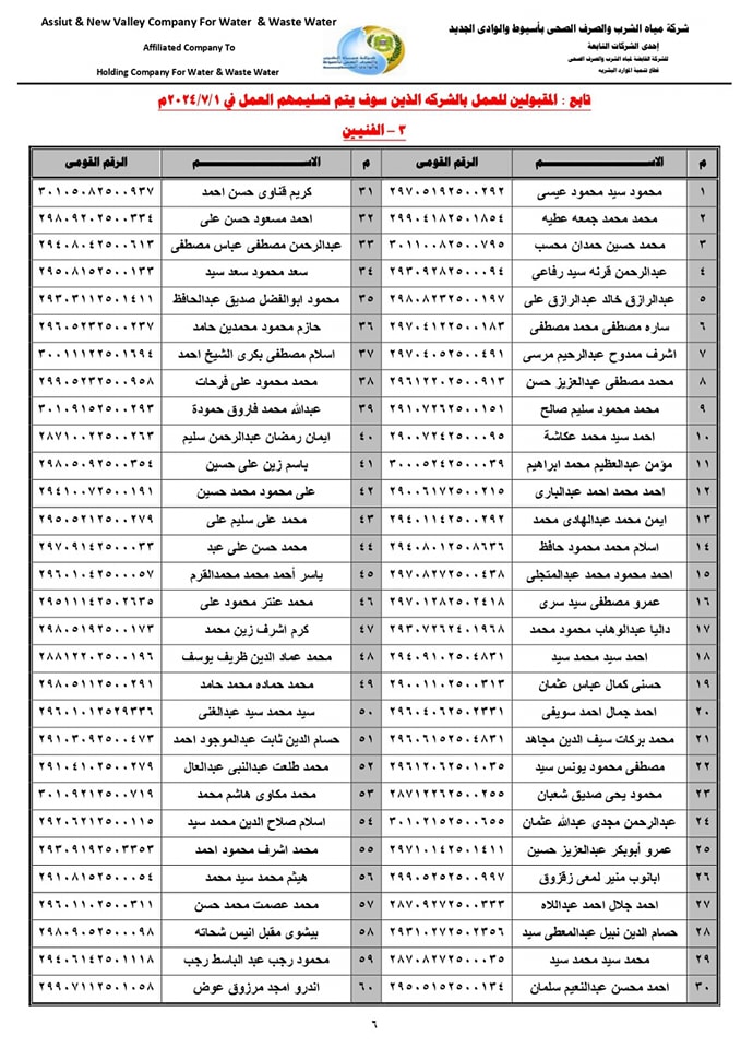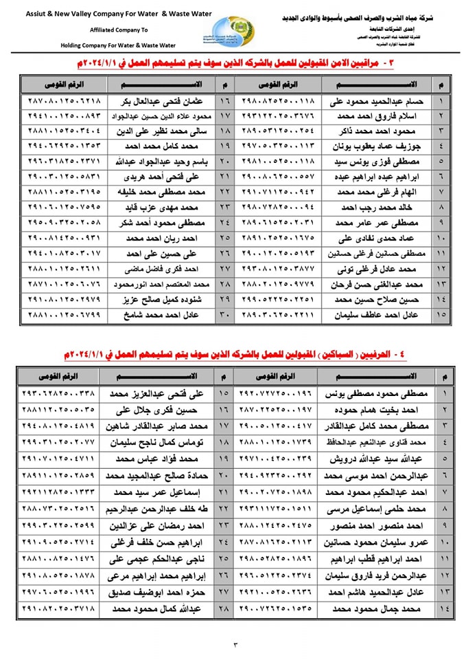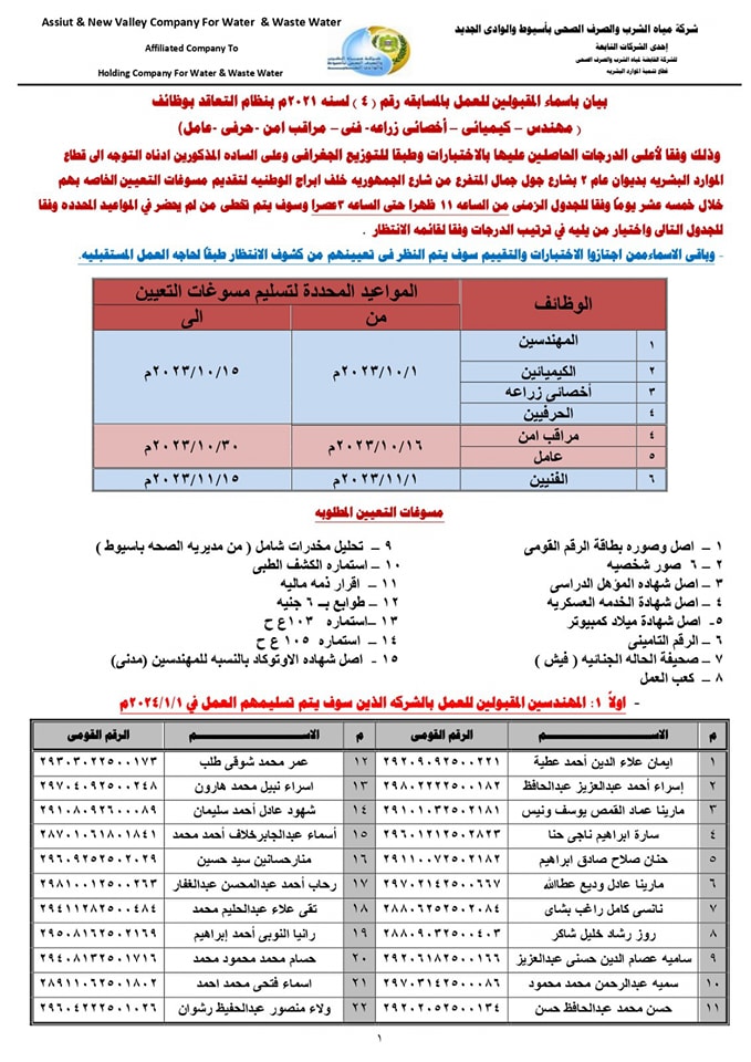 ننشر أسماء المقبولين للعمل بشركة مياه الشرب بأسيوط في المسابقة رقم (4)