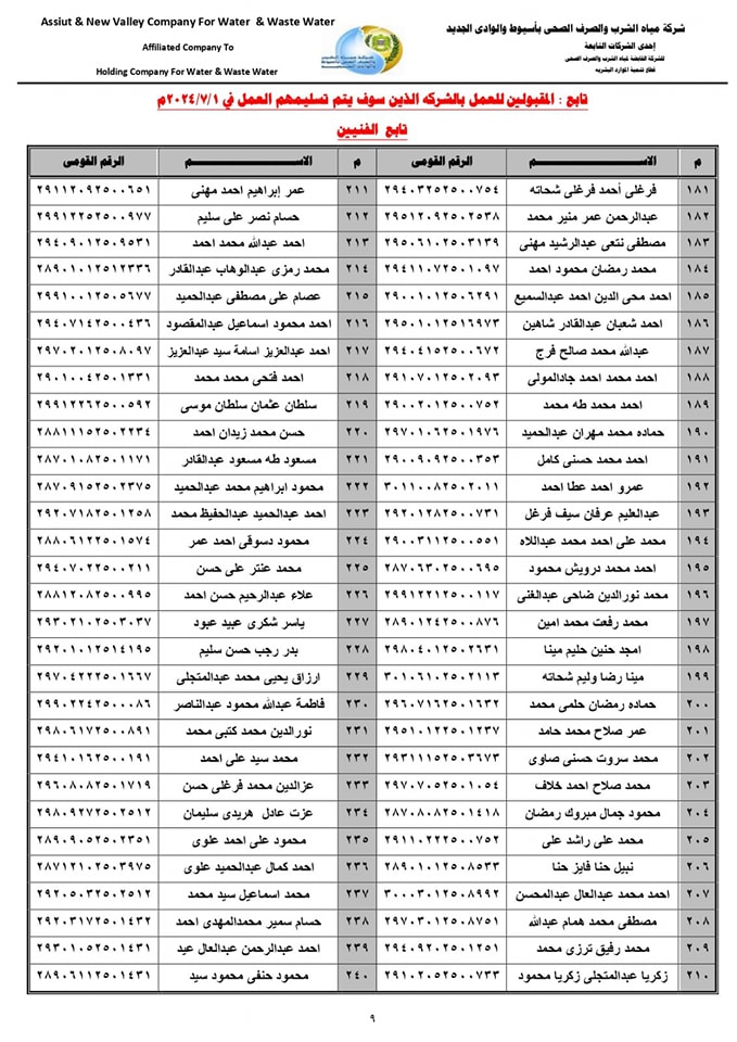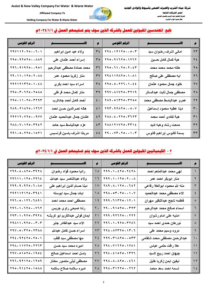 تهيب شركة مياه الشرب والصرف الصحي بأسيوط والوادي الجديد بالمقبولين للعمل الحضور في الموعد المحدد وتقديم المستندات والمسوغات اللازمة لاستلام العمل.